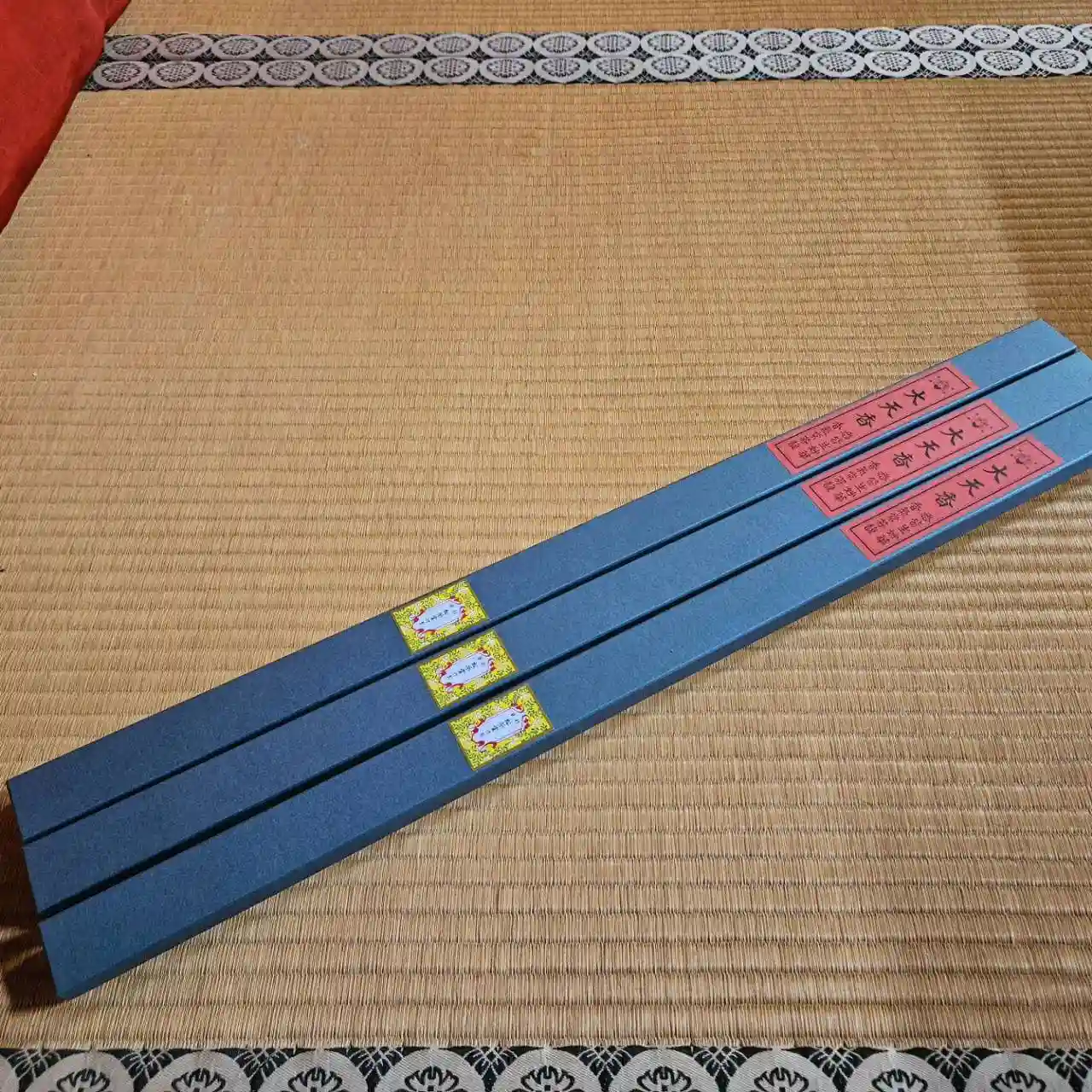 毎朝欠かさず焚いている長尺線香(73㎝)。約6時間燃え続けます。箱書きにある「悉皆生妙華 香気常芬馥」とは、仏様の知恵と慈悲によって、すべてが妙なる花を咲かせ、香りが常に満ちるように、と願いが込められています。訪れる皆様の心に、安らぎと清らかさをもたらすこのひとときを、共に感じていただければ幸いです。