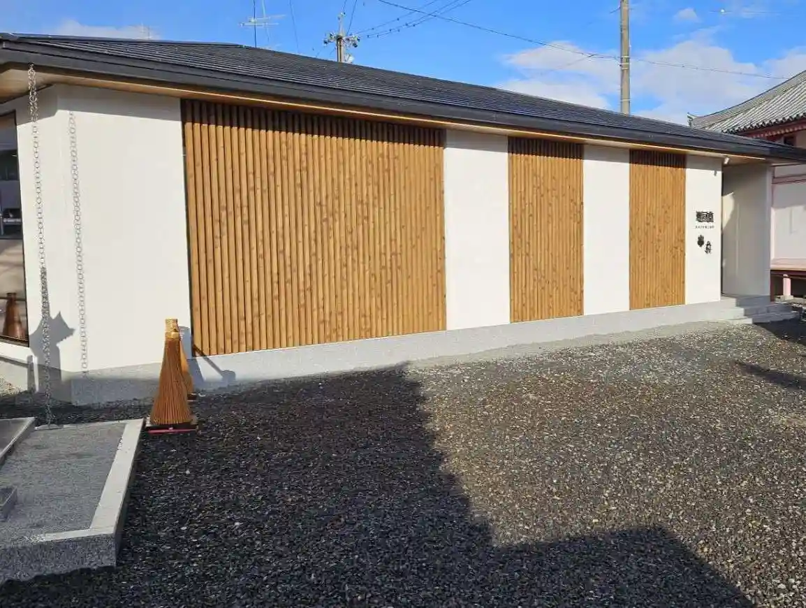 将来の災害等を見据え、安心・安全にお参りいただけるよう構造面を強化するとともに、外観は境内の納骨堂「恵日堂」と調和する白壁と格子意匠を採用し、境内全体に統一感を持たせています。