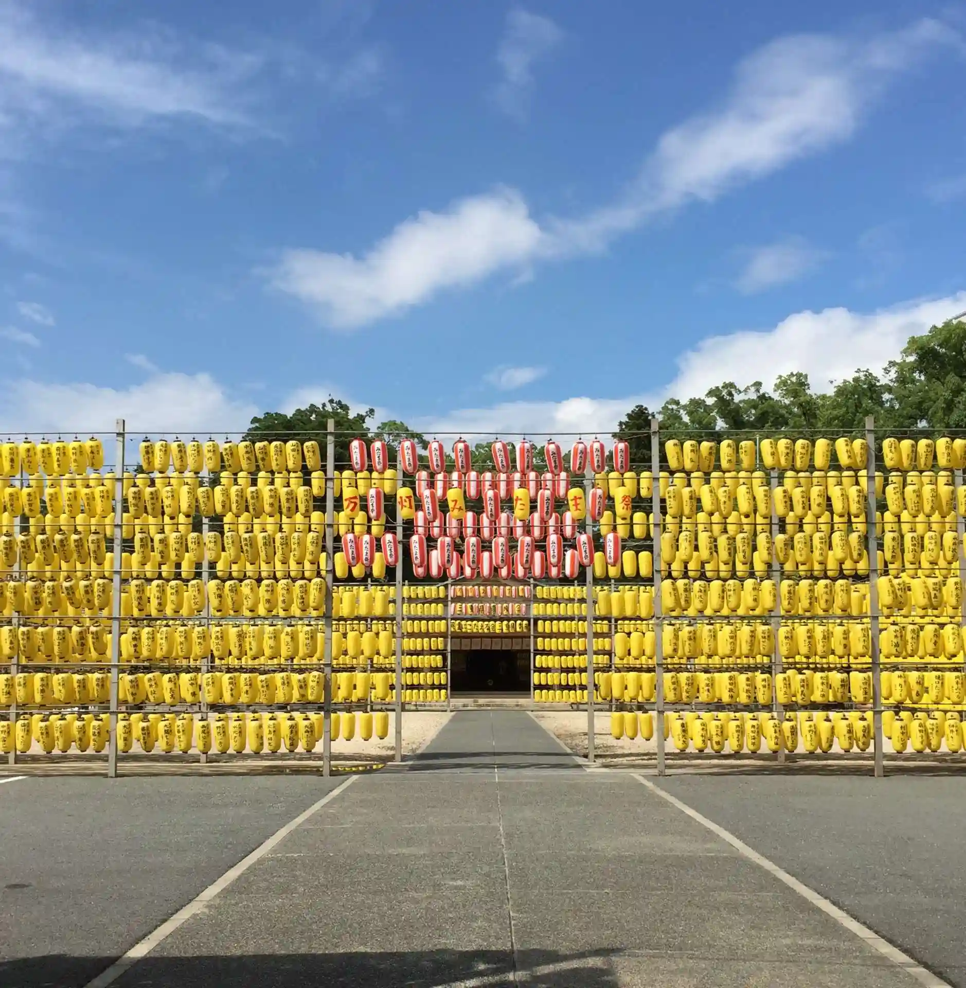 昼間に参拝したので青空の下の提灯でしたが、夜になると灯されてとても幻想的で美しいようです。