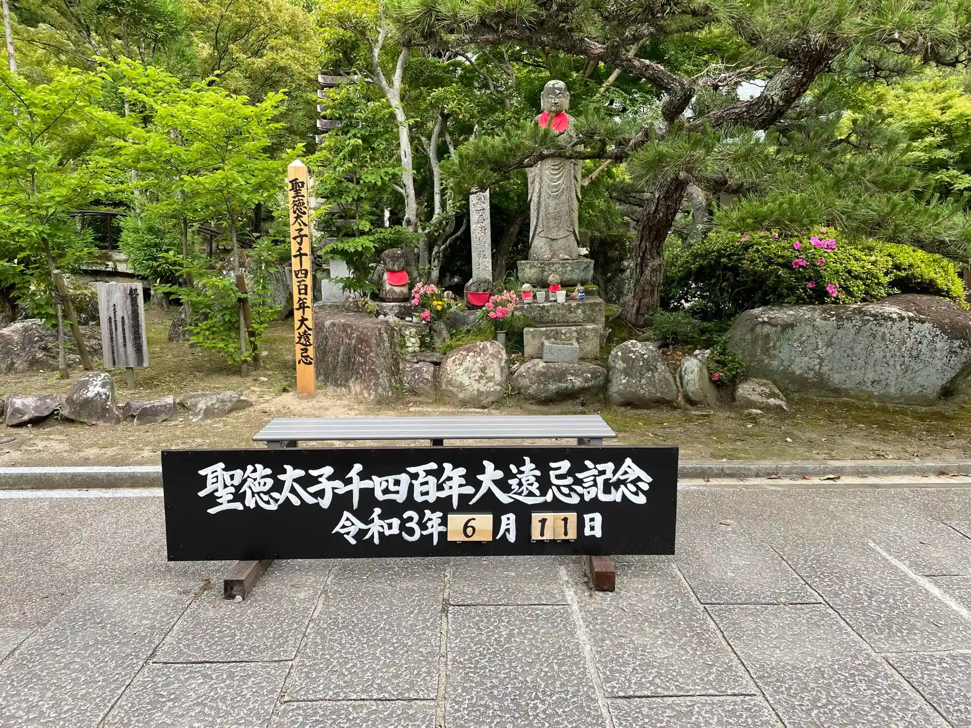 風雨に耐えながら聖徳太子の松前で記念写真ボードして頑張っていましたが、ついに劣化して三代目(知人の印刷会社さん作成)になりました。