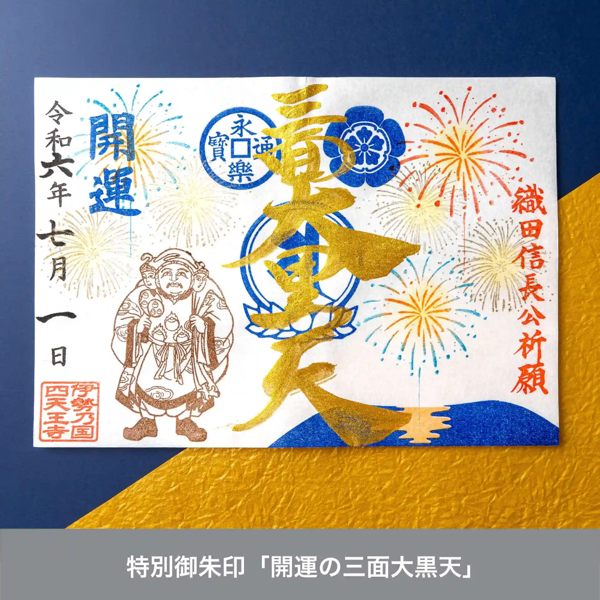 ・【夏限定】特別御朱印「花火と開運の三面大黒天」(金文字)