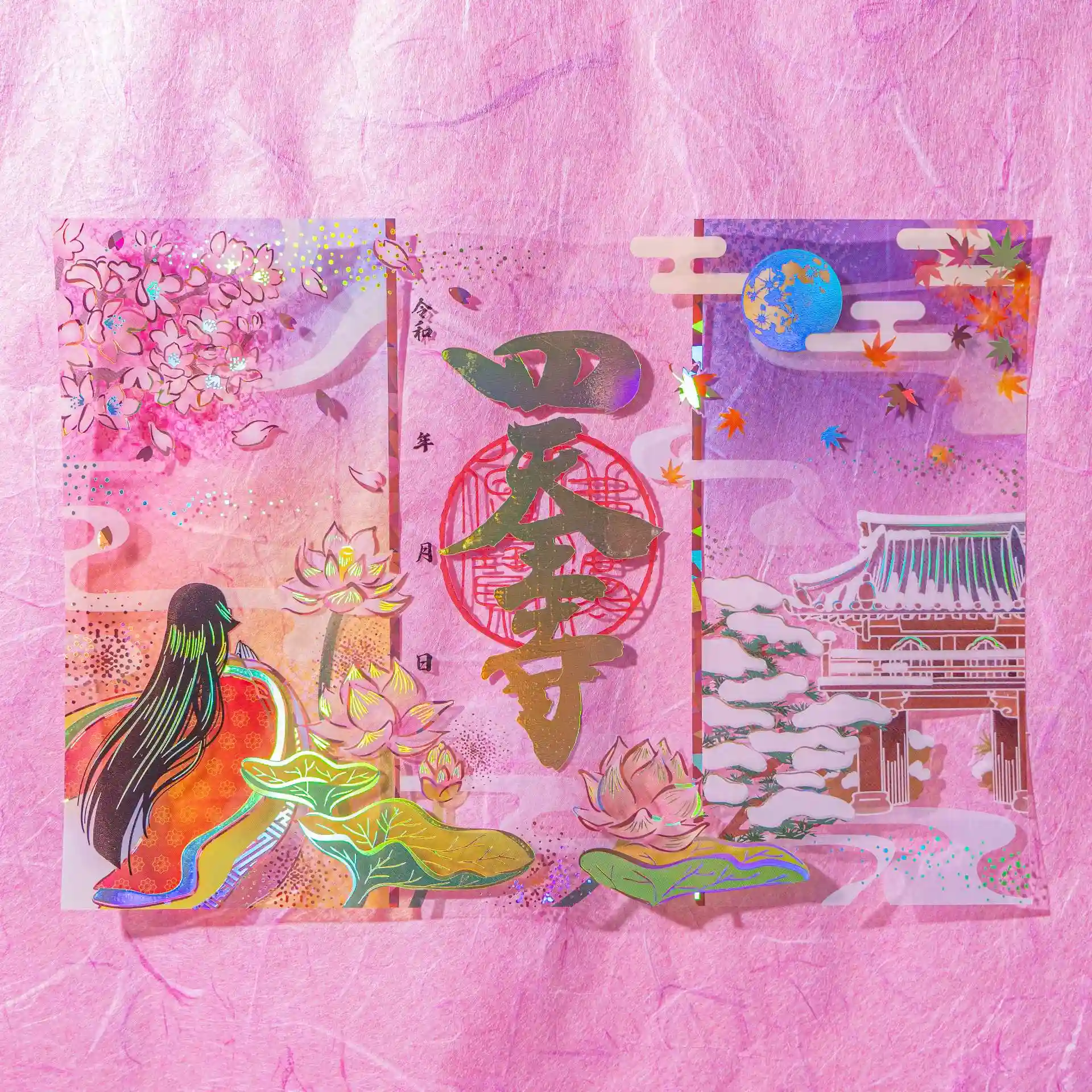 春の桜、夏の蓮、秋の紅葉と中秋の名月、冬の雪景色と聖徳太子ゆかりの松の木――四季の移ろいがこの一枚に描かれ、四天王寺の景色を映し出します。