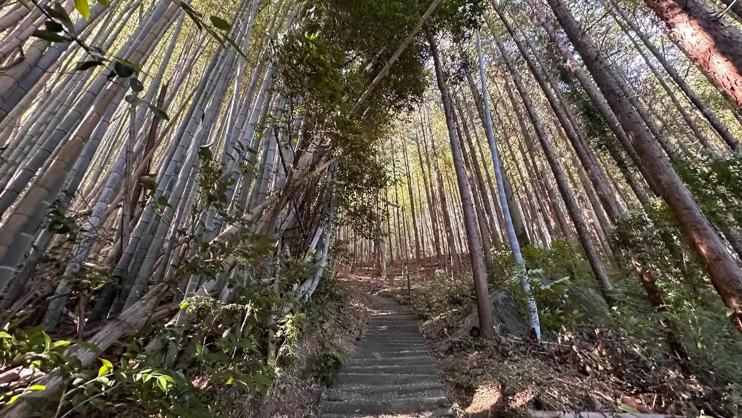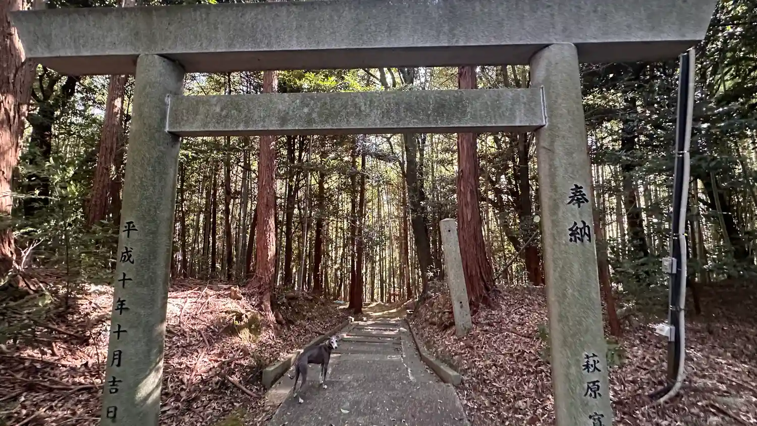 延喜式内社、阿由太神社の論社の一社です、鳥居をくぐると左に竹藪、右は杉の木の森階段の後は、登山道の…