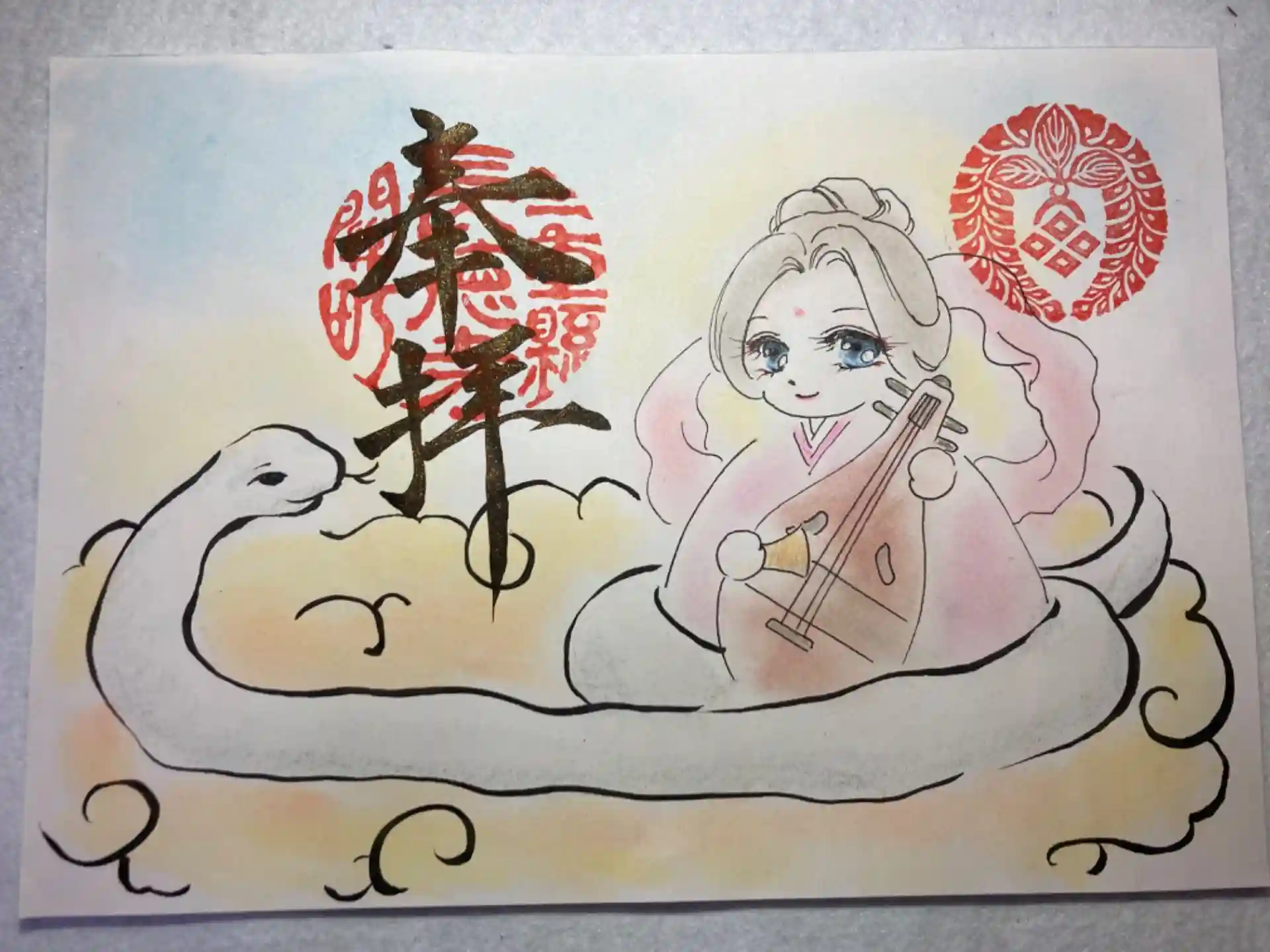 史の新作できました。巳年にちなんで弁財天さまと白蛇のイラストになります。