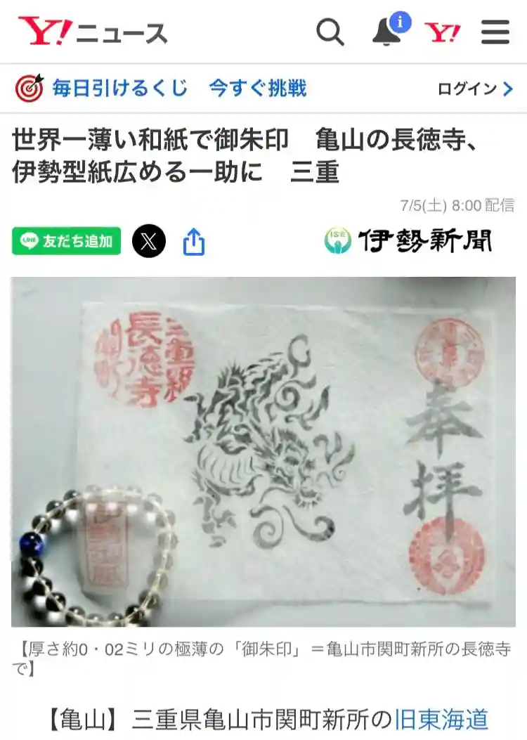 世界一薄い和紙で御朱印 亀山の長徳寺、伊勢型紙広める一助に 三重(伊勢新聞) - Yahoo!ニュース