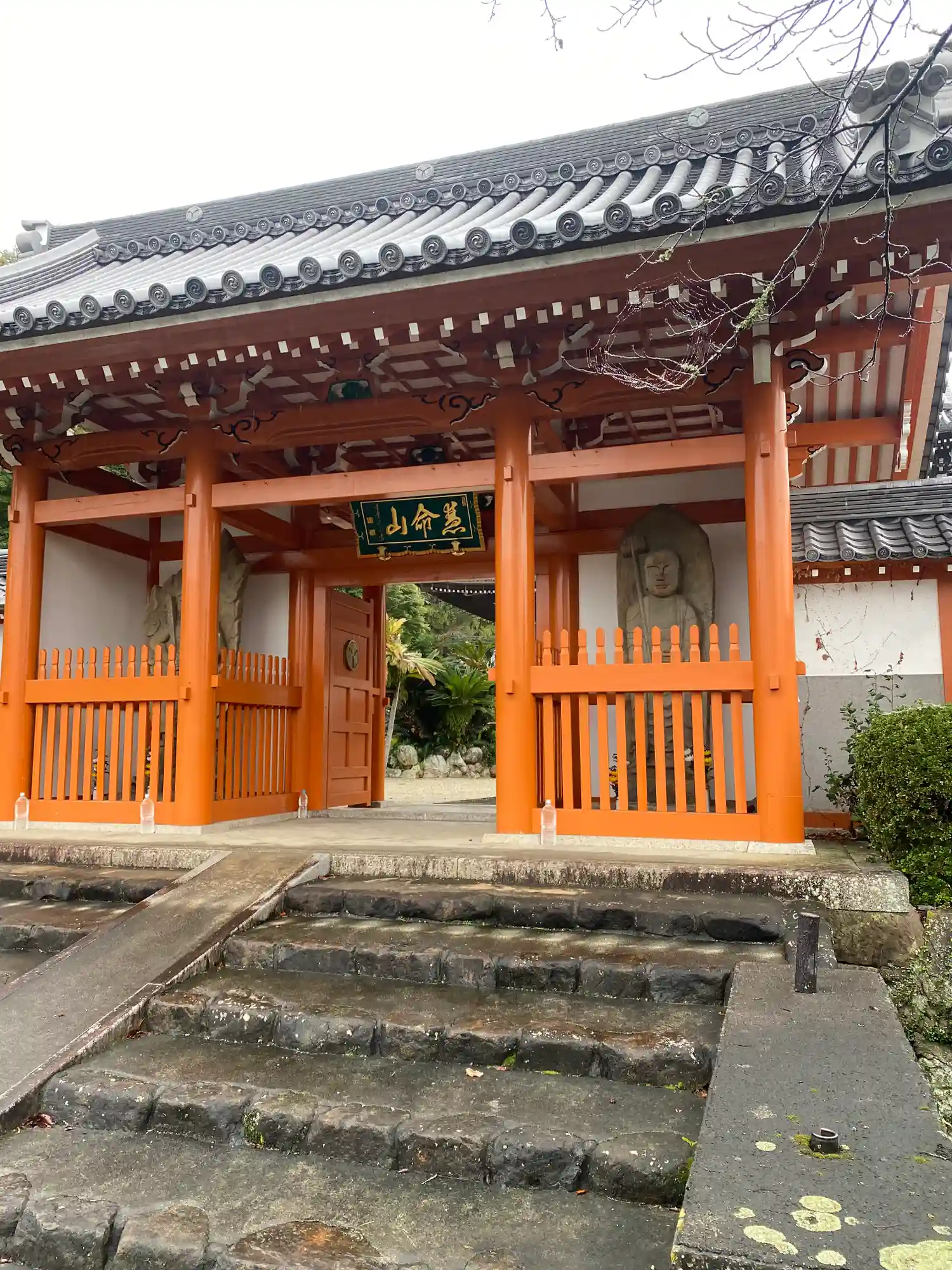 朱色の橋の先に朱色の山門がありとても綺麗です。山門の先には大きな本堂があります。
