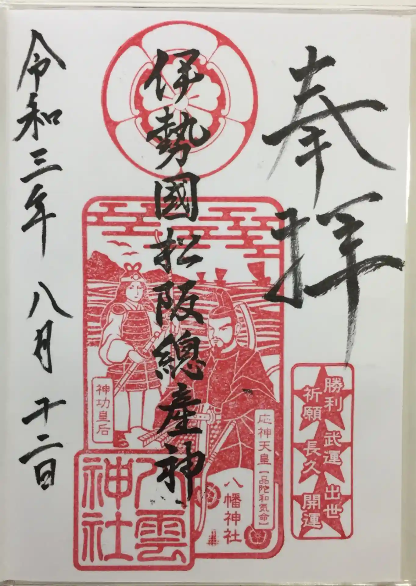 応神天皇と神功皇后の勇ましいお姿が細部まで表現された御朱印です。