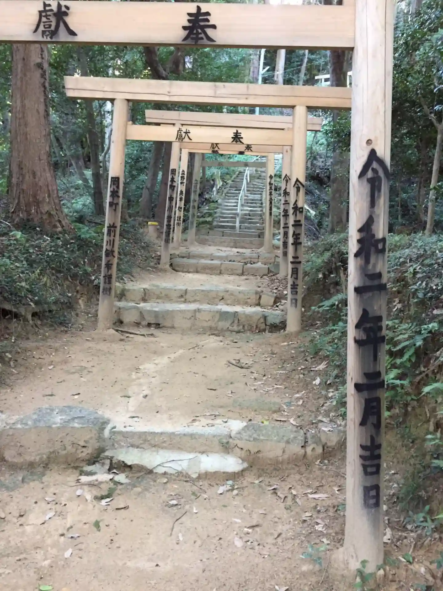 参道の入り口には大きな鳥居がたくさんあります。本堂へは山道を上りますが、距離で330mあり約400…