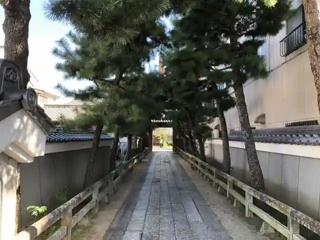 駅前通り商店街から、脇道に入ると、狭いながらも綺麗な松並木の参道が見えたら、そこが本覚寺です。山門をくぐると、立派な松が本堂の前にあります。