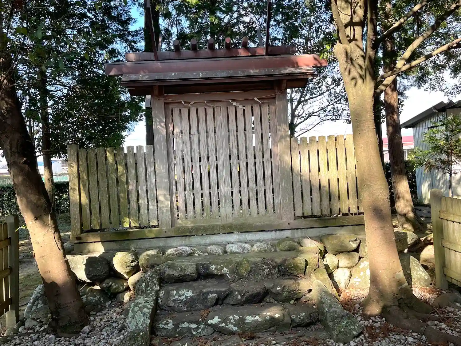 集落の一角に鎮座している地域の氏神さまです。御祭神が天忍穂耳命となっているので、近くの熊野・宇氣比神社の御祭神と同じです。