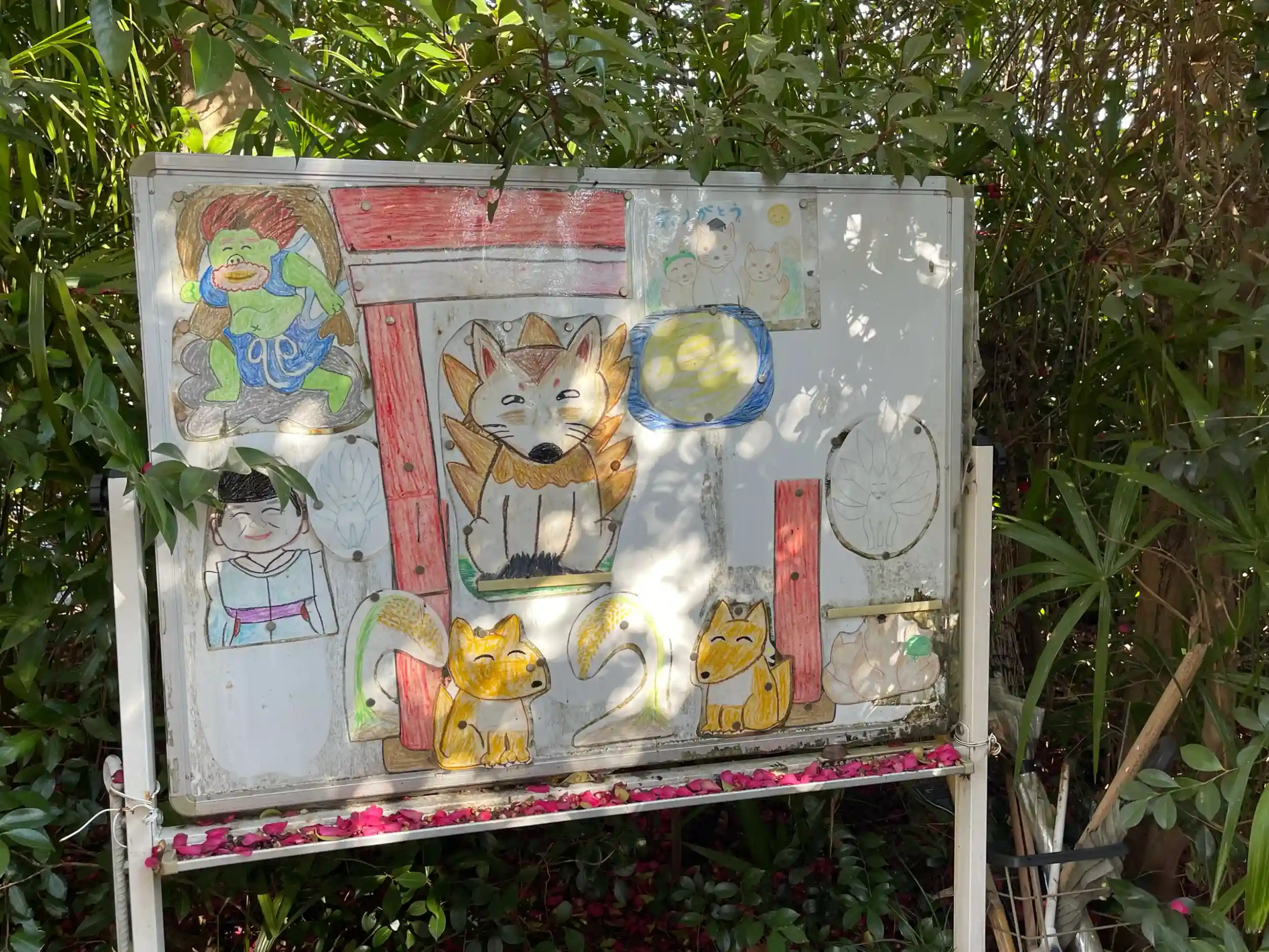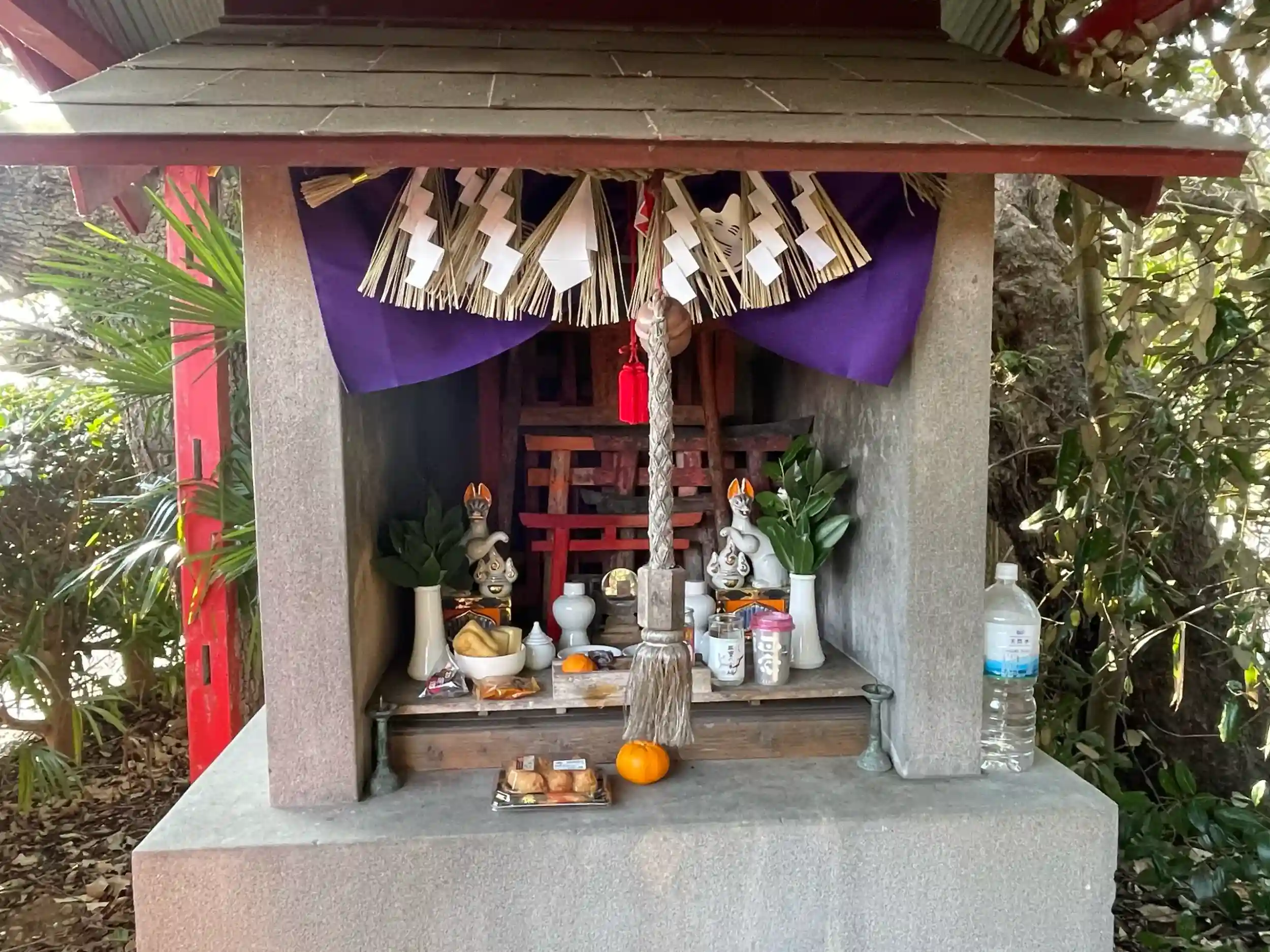 道路脇にぽつんとあるお稲荷様です。御供えが沢山あげられており、地元の方に大切にされているのがわかるお稲荷様です。