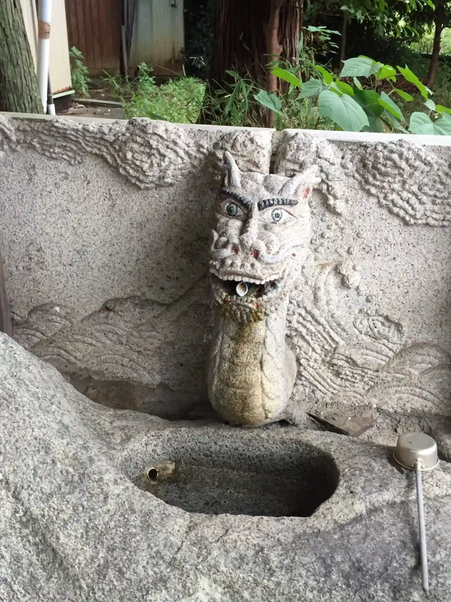 手水舎の龍さんは石造りで、まるで人間のようなユーモラスな表情