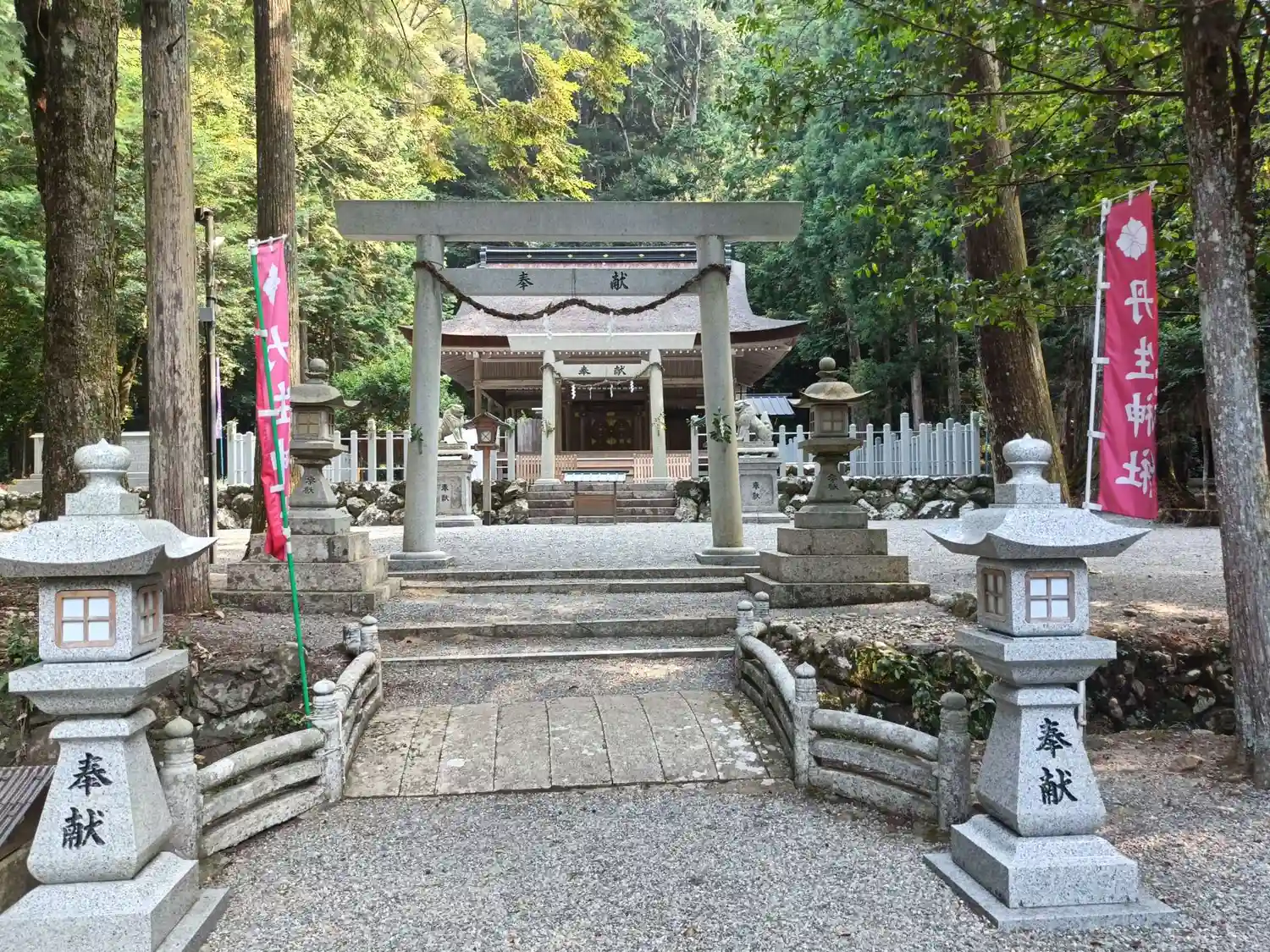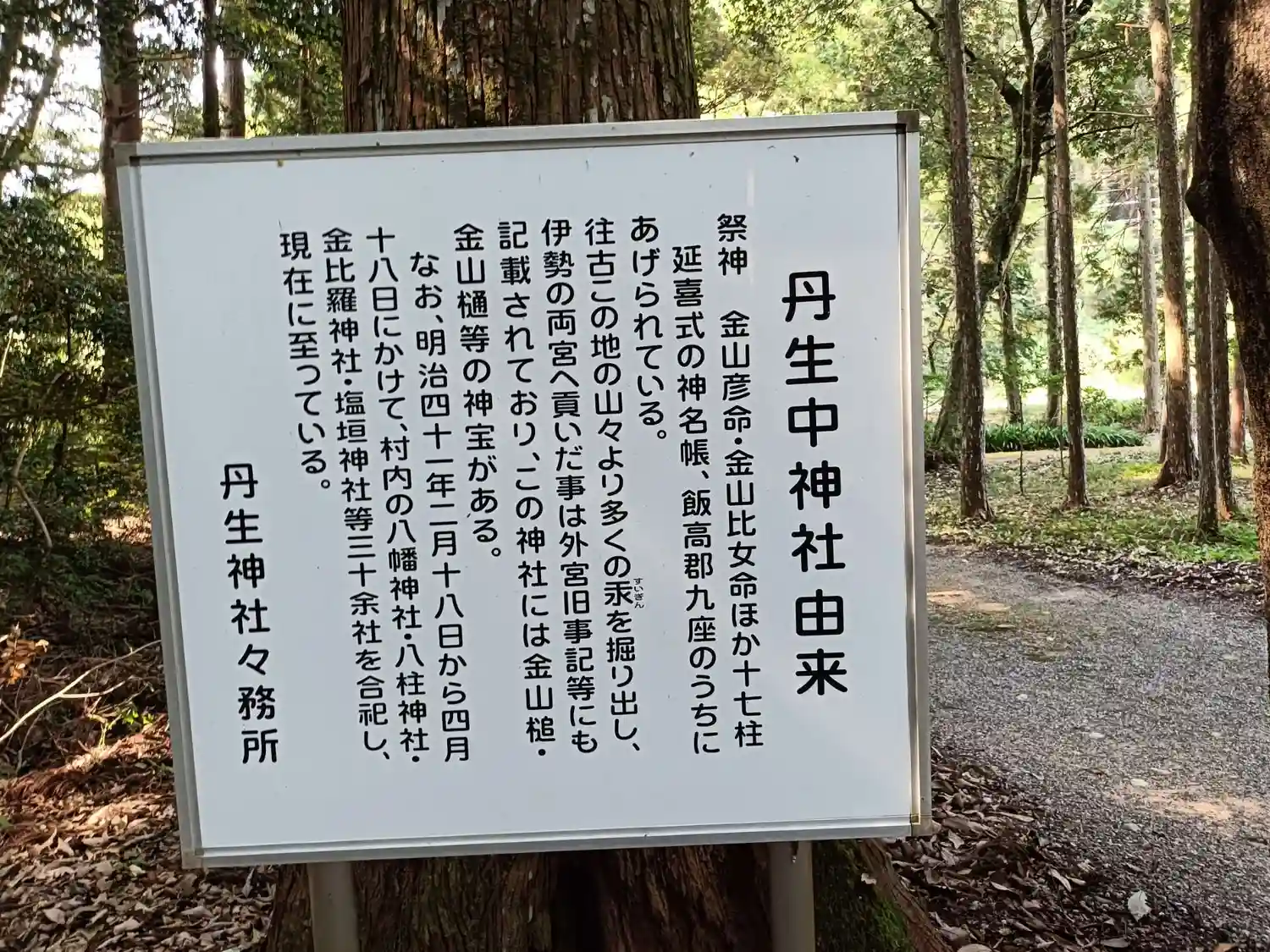 | ご由緒 | 当社の創始は、社伝によると継体天皇16年という。往古より当地は水銀の産地として名高く、この地の守護神として奉斎されていた。また、『本朝年代記』に嵯峨天皇弘仁10年(819)、伊勢丹生神に祈雨祈晴した記載が見られるように、当社は古よりその方面に霊験あらたかとされ、更に『延喜式神名帳』多気郡五二座搭載の1社にも数えられる。室町以降、伊勢国司北畠氏はじめ松阪城主古田重治、歴代紀州藩主から篤い尊崇を得た。明治41年4月14日、当社境内社の高野神社など24社を当社に合祀した。尚、明和年間(1764〜72)以後今日に至るまで、社殿造営には神宮式年遷宮の際に拝領した古殿の用材を利用するのを慣例とする。