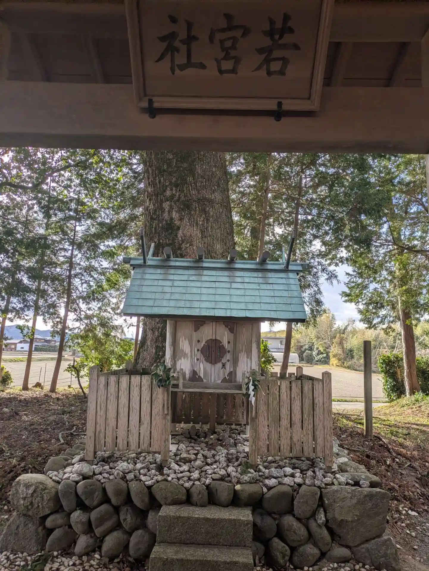 田園風景の中に佇む小さな神社の鳥居をくぐると
