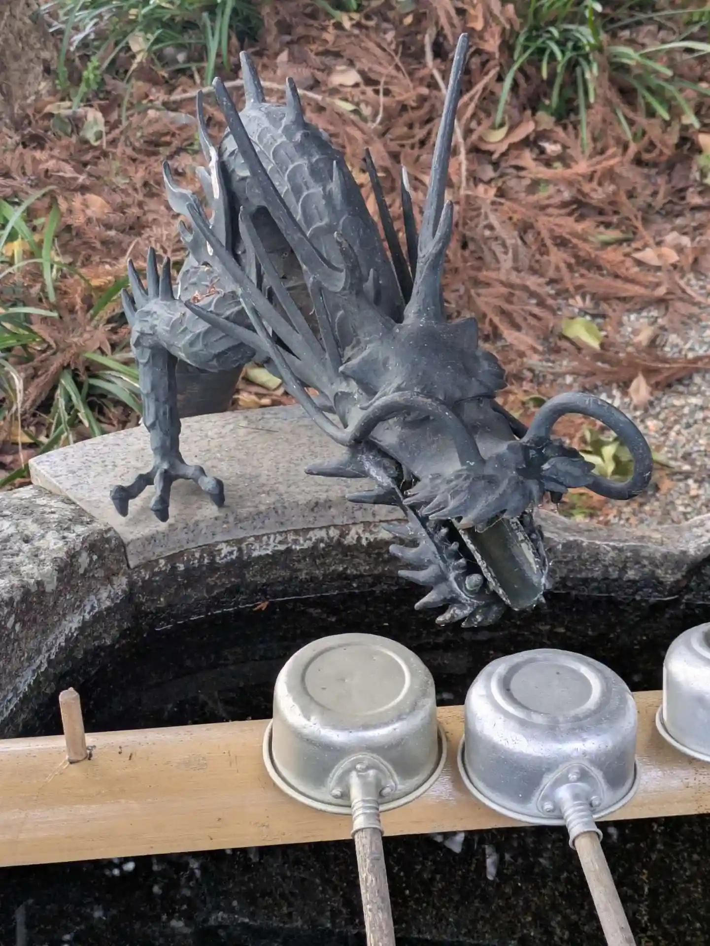 龍の手水場、そしてずらりと並ぶ神々の名前が