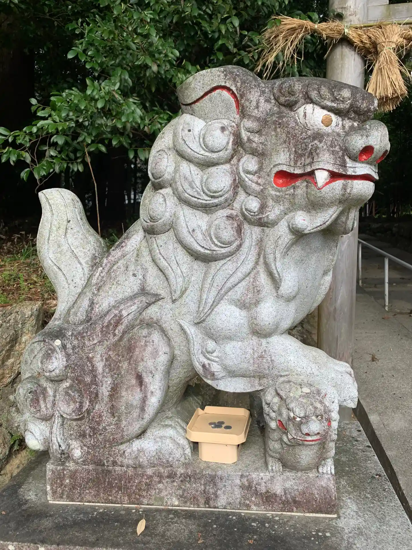 狛犬様に赤色がついてるのはこの地域ではよく見られるのでしょうか?鞠をもっている狛犬様で可愛らしかったです!