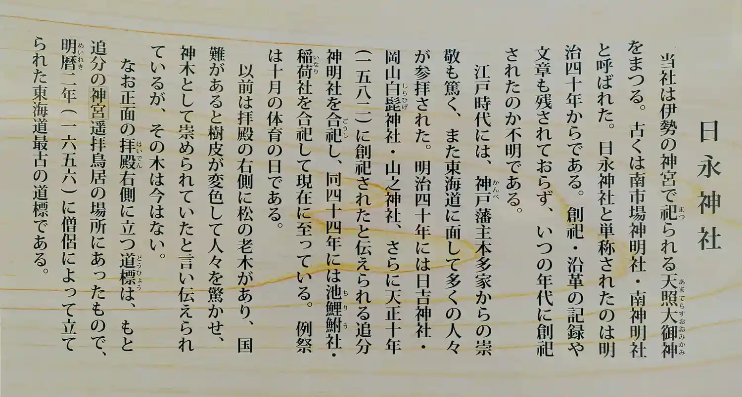 慶長14年、天照大御神を当地に勧請し、南市場神明社が創建されました。その後、社名を南神明社と改称。明治40年、日吉神社、岡山白髭神社、山之神、並びに天正10年創建と伝えられる追分神明社をそれぞれ南神明社に合祀の上、日永神社とし、同44年、日永字蔵屋敷の池鯉鮒(ちりゅう)社、字登城山の稲荷社を合祀しました。