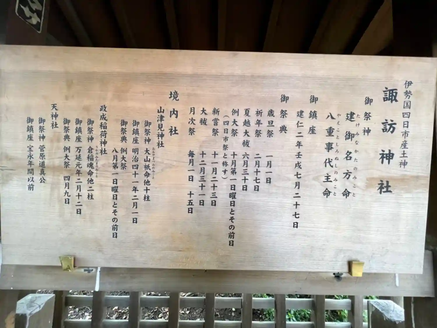 | ご由緒 | 鎌倉時代初期の建仁2年(1202)に、信州の諏訪大社の御分霊をこの地に勧請し創祀されたと伝わっております。建御名方命(タケミナカタノミコト)と八重事代主命(ヤエコトシロヌシノミコト)を主祭神とし、四日市・浜田の総産土神として崇敬を集め、地域の歴史とともに歩んでまいりました。