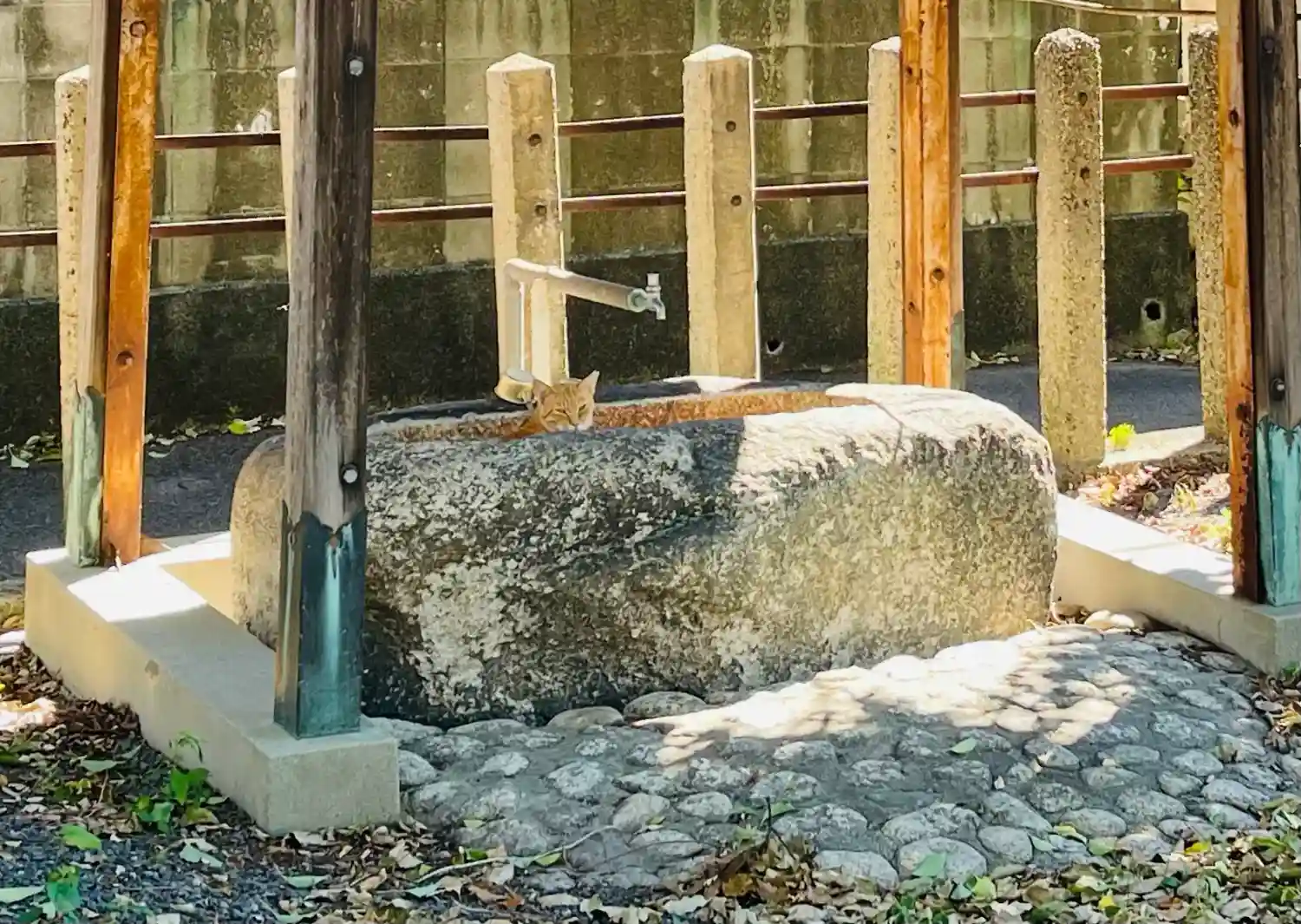 手水舎の中で猫🐈ちゃんが昼寝してました
