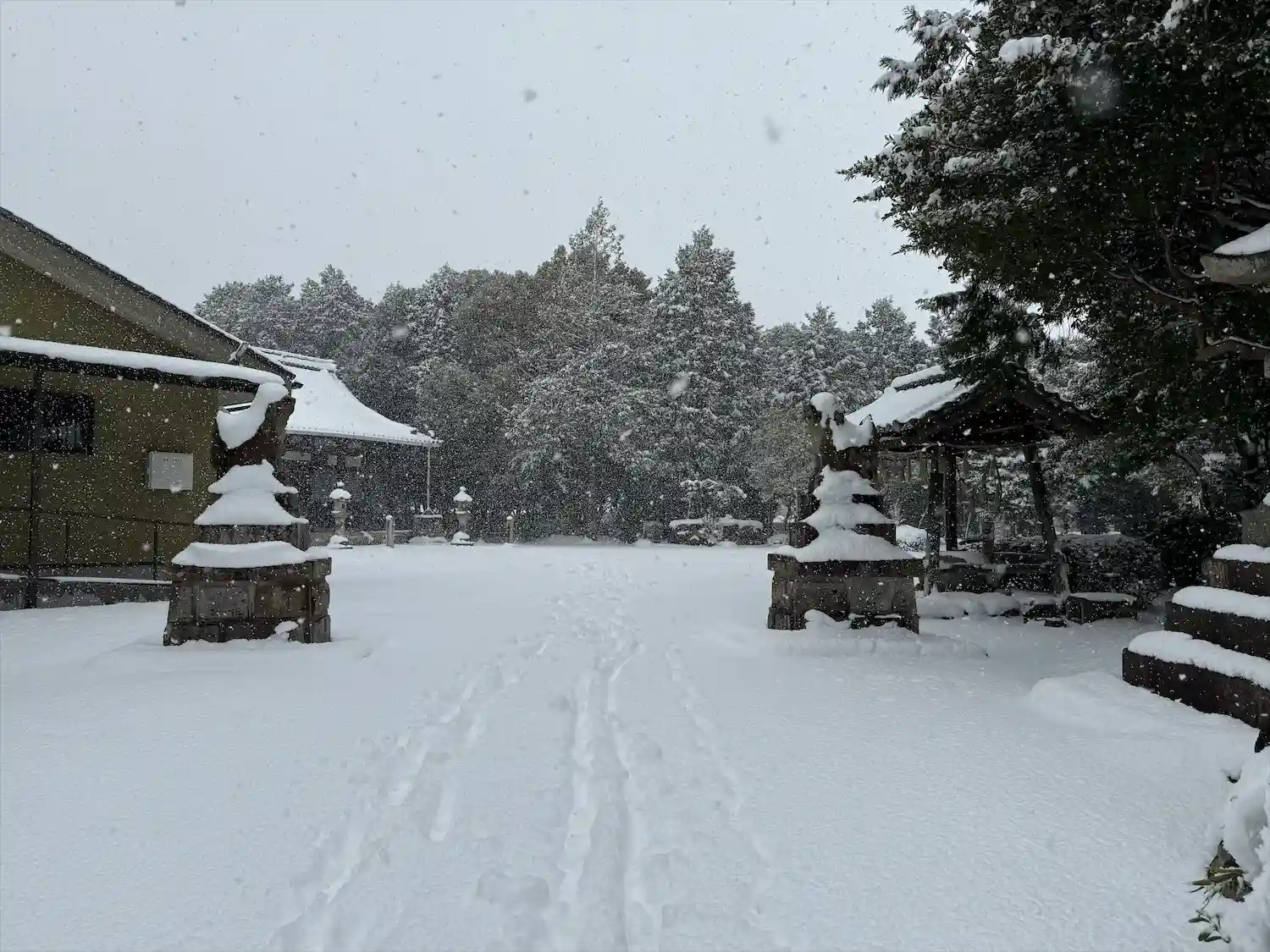 鳥居から先に行くと立派な社殿があります。境内にある動物の像は何でしょうか?