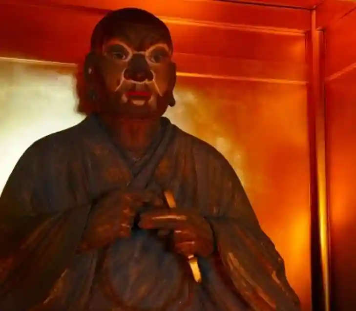 本堂へ行って内陣に入らせて頂きました。その奥がゴツい扉の収蔵庫になっていて、真ん中の厨子に本尊・元三大師坐像、右側に薬師如来立像と誕生釈迦仏、左側に地蔵菩薩坐像が祀られていました。元三大師坐像は胎内墨書により1351年の南北朝時代の製作、薬師如来立像は平安時代後期の製作で今は無き薬師堂の本尊と伝わります。誕生釈迦仏と地蔵菩薩坐像は鎌倉時代の製作と製作時期は町々です。