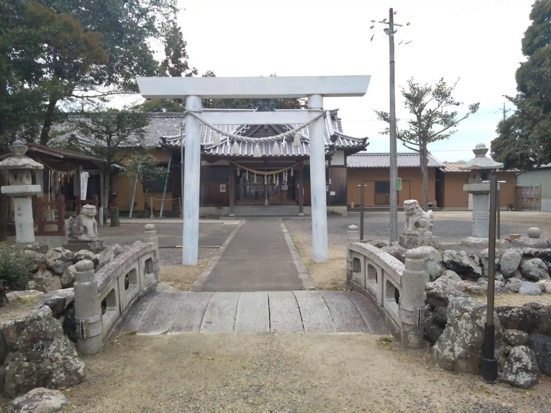 まっ白に塗られた鳥居が妙に目立ちます。大きな椎の木があります。
