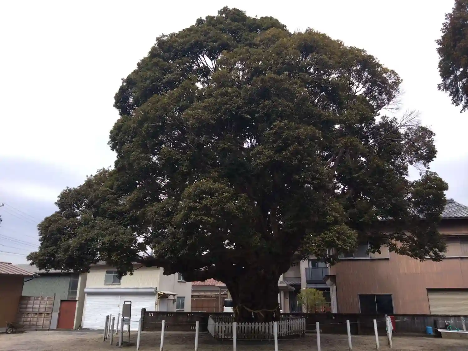 まっ白に塗られた鳥居が妙に目立ちます。大きな椎の木があります。