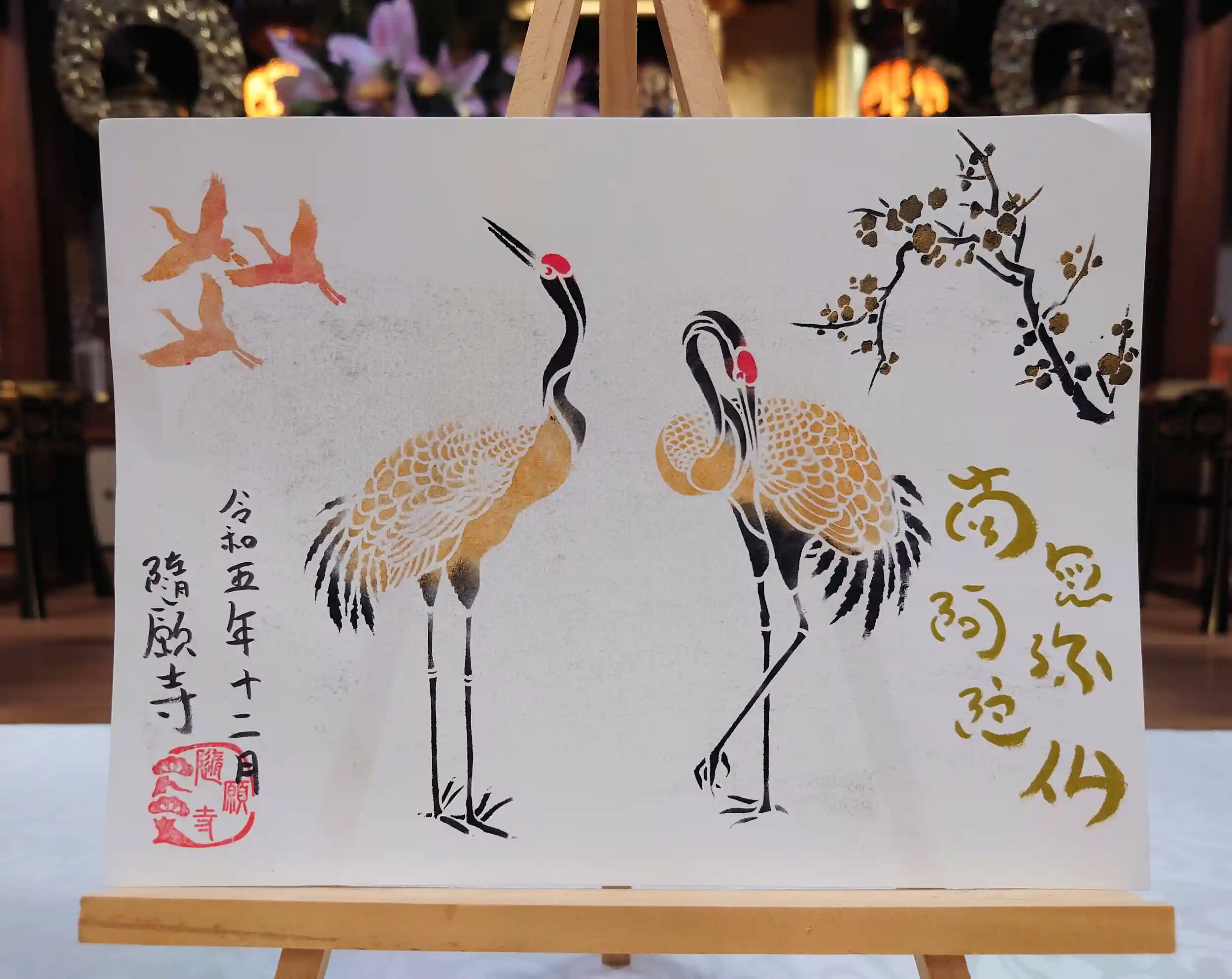 背景は黒や紺のパステルで着色し、その上から金色、黒色、赤色のアクリル絵の具で鶴などを描きます。右下に南無阿弥陀仏の六字名号、左下に寺院名と日付を書き入れます。