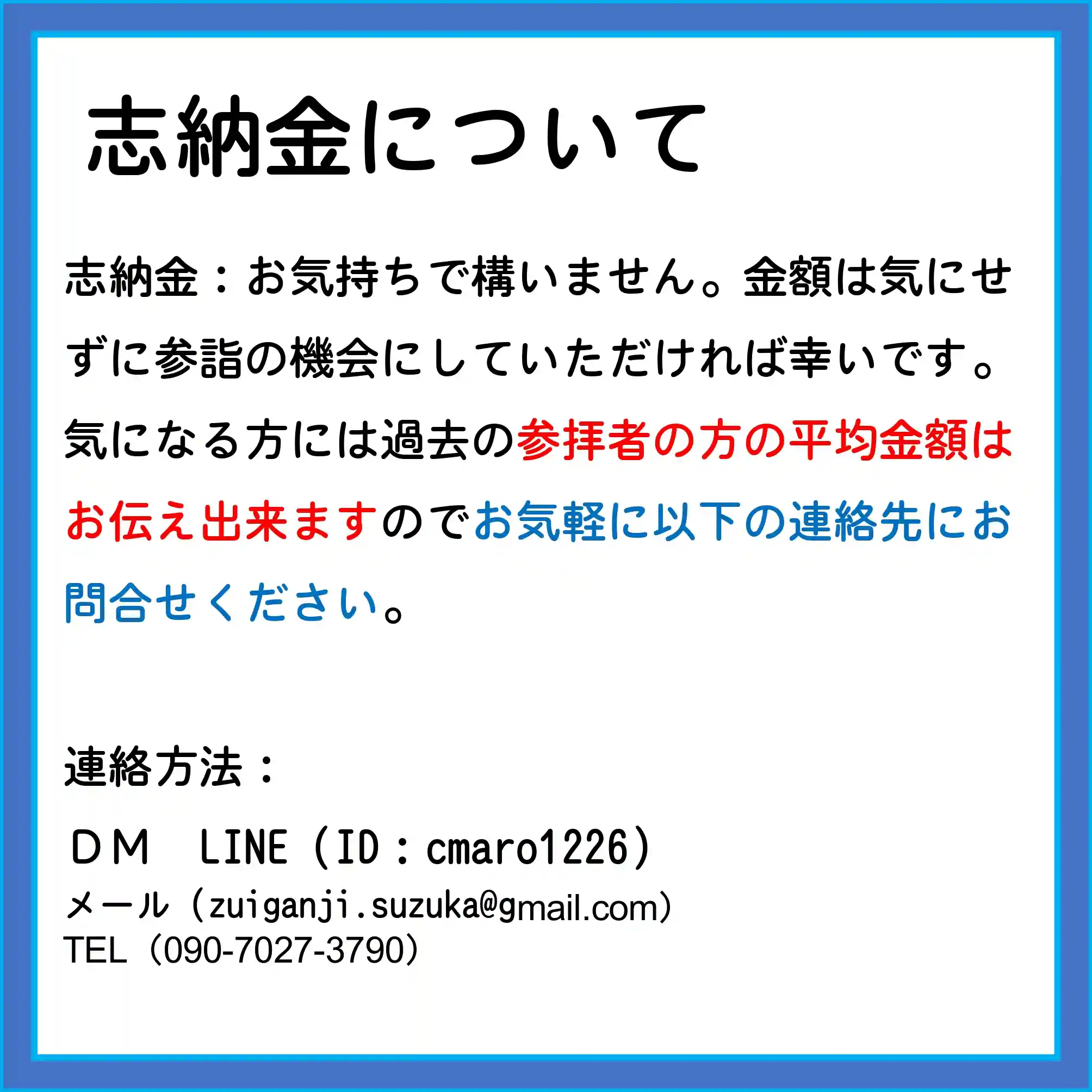 お気持ちで構いません。金額は気にせずに参詣の機会にしていただければ幸いです。気になる方には過去の参拝者の方の平均金額はお伝え出来ますのでお気軽に以下の連絡先にお問合せください。