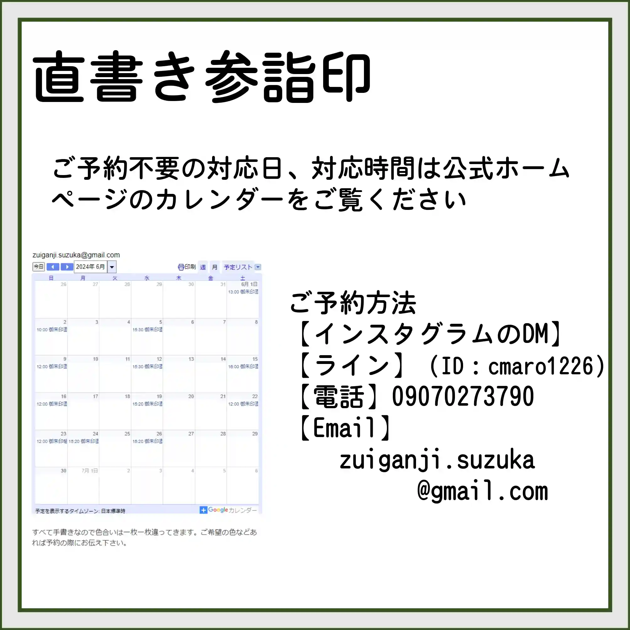 開催日:直書きは土曜日、日曜日でご予約ください。平日も対応可能ですが夕方~夜のお時間になります。平日の日中対応は都度公式ホームページに記載します。