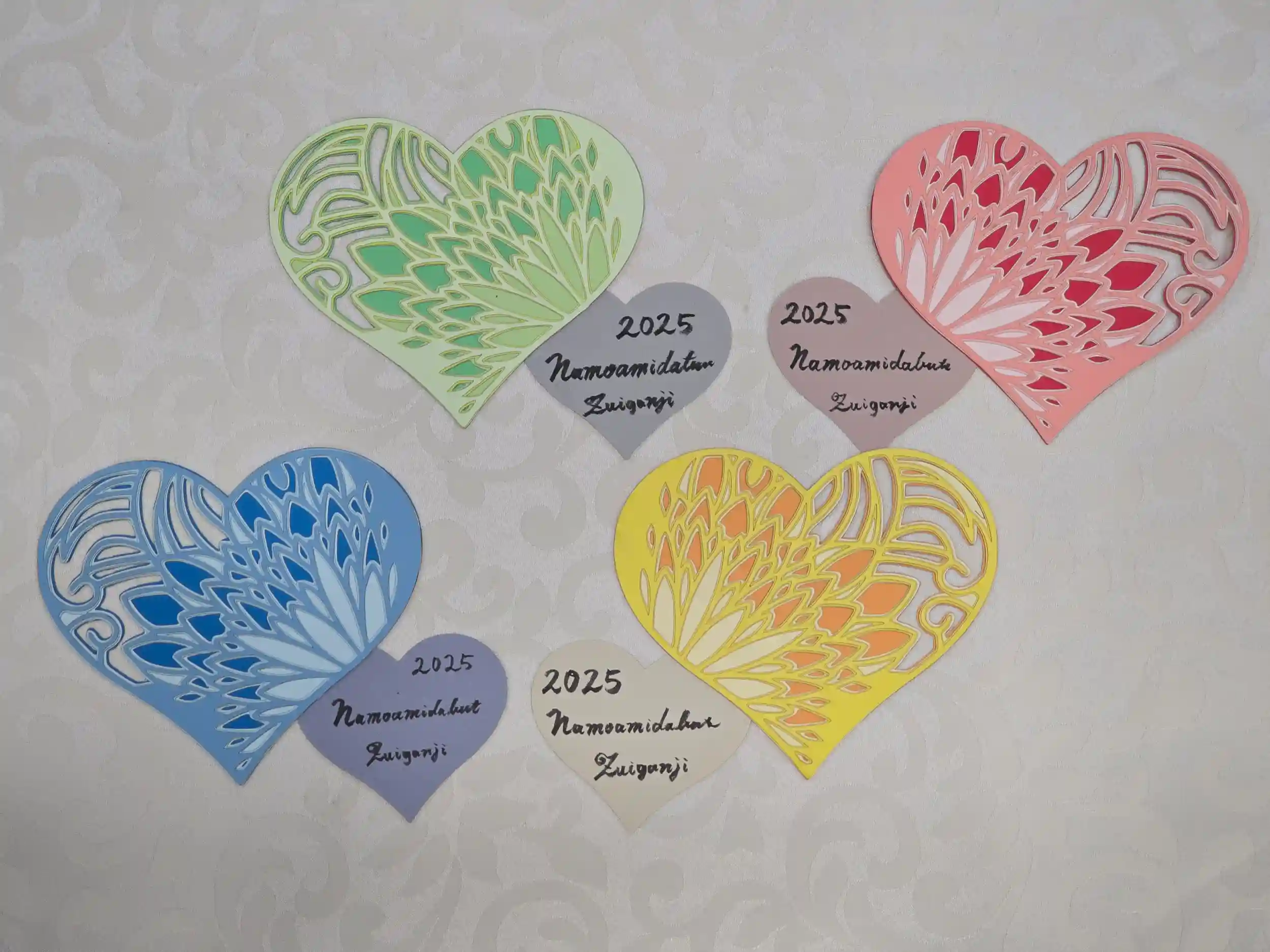 4色の紙からハート型を切り出し、重ねて貼り合わせる切り絵参詣印です。