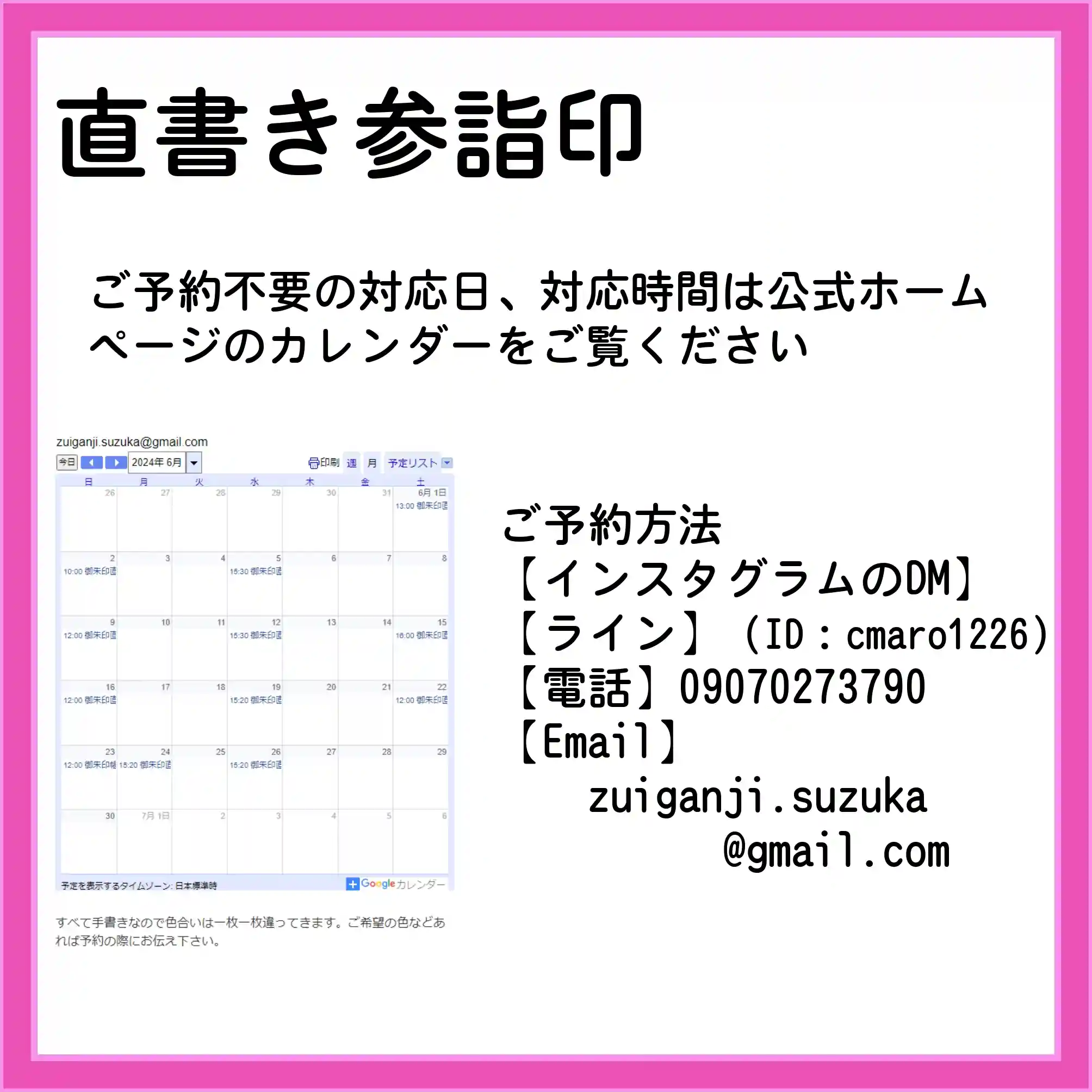 ご予約:法務・行事で書き手が留守のこともありますので可能な限りご連絡をお願いいたします。書き手不在の場合は書置きのお渡しや御朱印帳お預かりの対応になることもありますのでご容赦願います。
