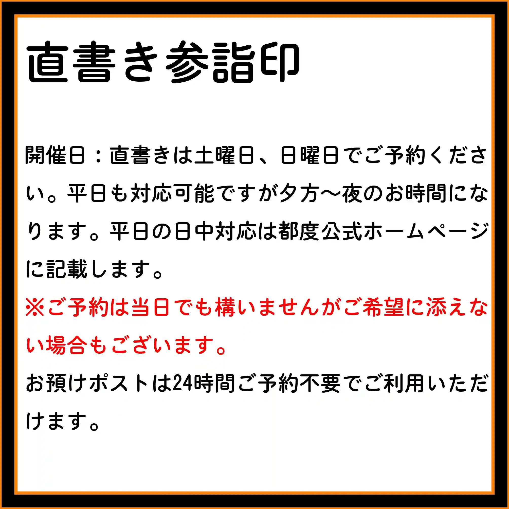 ご予約:法務・行事で書き手が留守のこともありますので可能な限りご連絡をお願いいたします。書き手不在の場合は書置きのお渡しや御朱印帳お預かりの対応になることもありますのでご容赦願います。