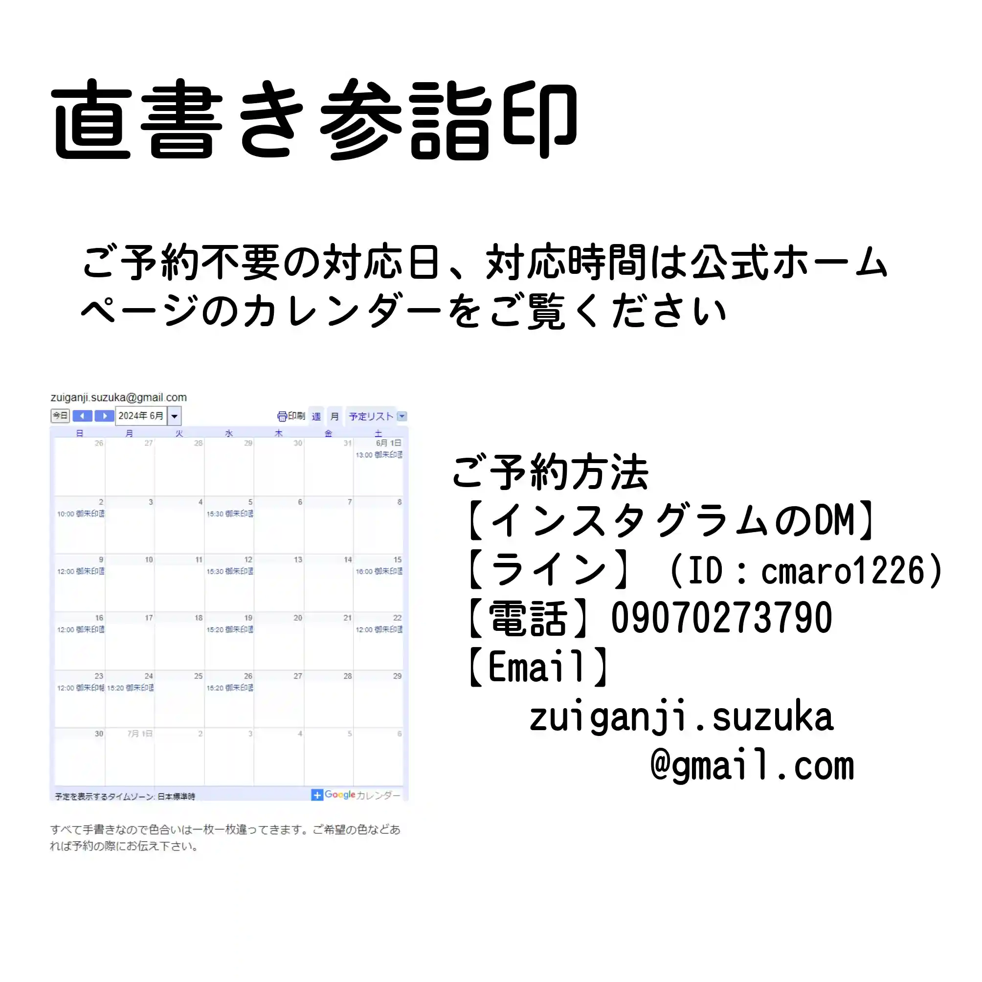 ご予約:法務・行事で書き手が留守のこともありますので可能な限りご連絡をお願いいたします。書き手不在の場合は書置きのお渡しや御朱印帳お預かりの対応になることもありますのでご容赦願います。