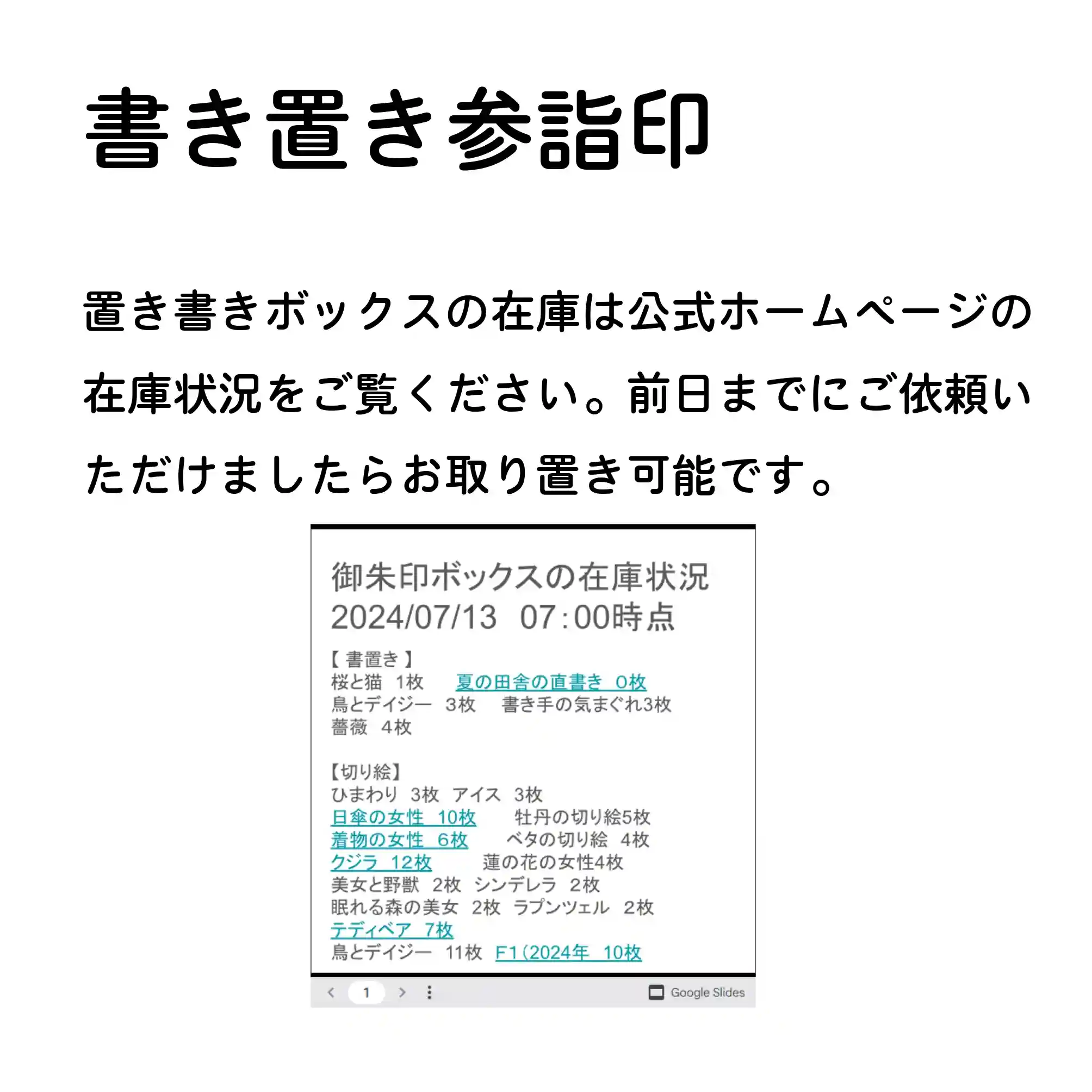 ※書置きボックスの在庫は保証いたしかねます。在庫確認のご連絡はご遠慮なくいただければ幸いです。
