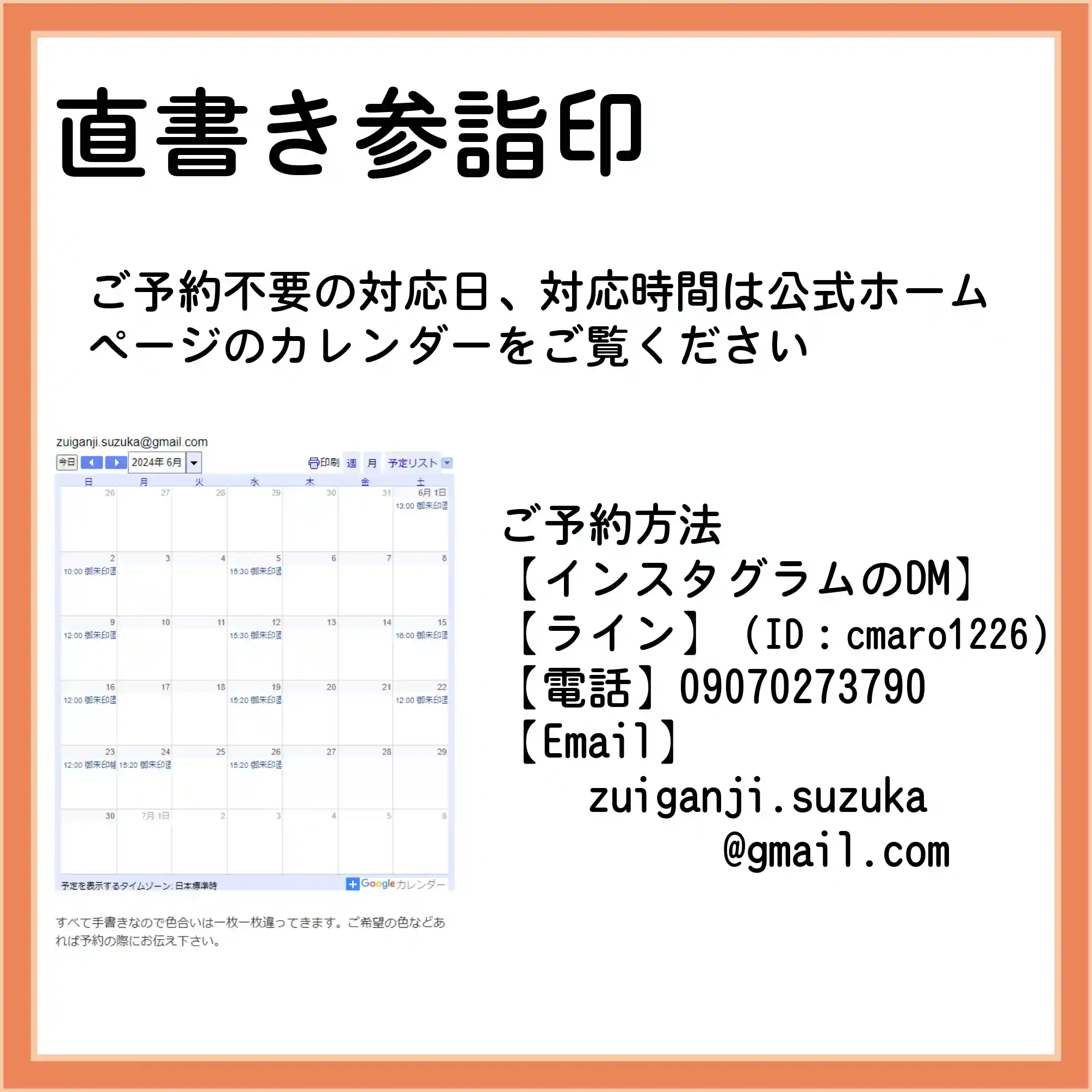 ご予約:法務・行事で書き手が留守のこともありますので可能な限りご連絡をお願いいたします。書き手不在の場合は書置きのお渡しや御朱印帳お預かりの対応になることもありますのでご容赦願います。