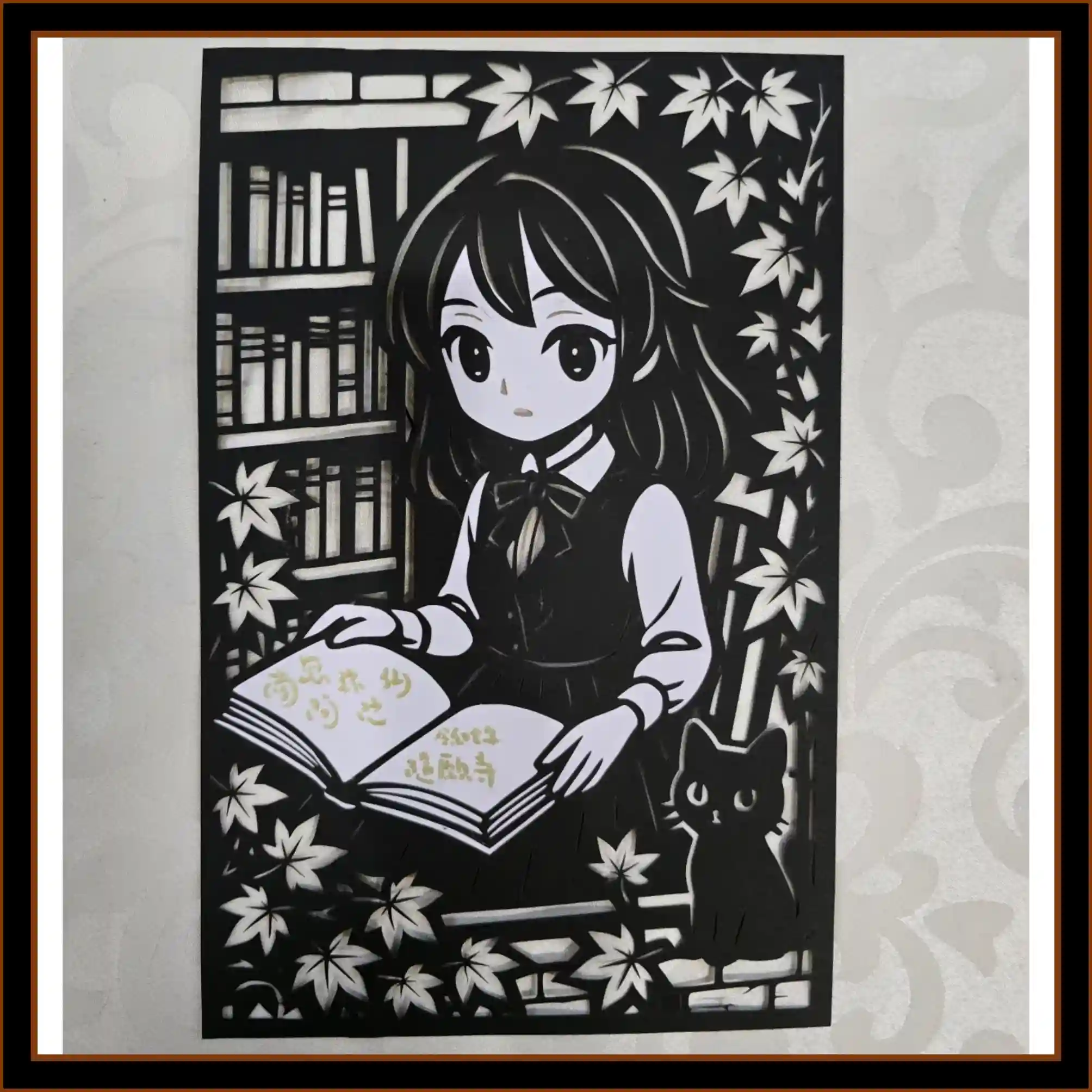 黒の台紙から読書をしている女学生と落葉、黒猫を切り出します。女学生が読んでいる本には南無阿弥陀仏の六字名号を書き込みます。