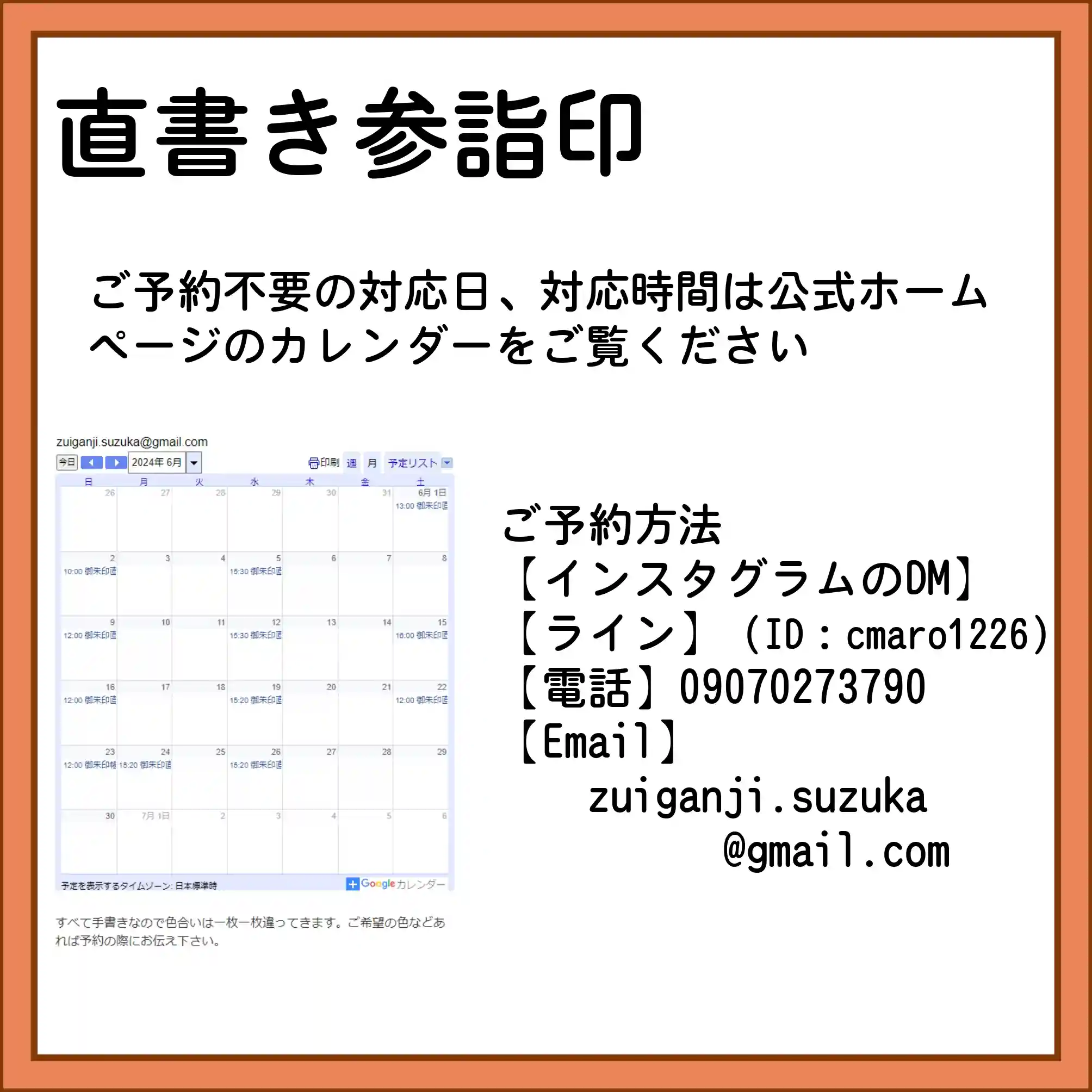 ご予約:法務・行事で書き手が留守のこともありますので可能な限りご連絡をお願いいたします。書き手不在の場合は書置きのお渡しや御朱印帳お預かりの対応になることもありますのでご容赦願います。