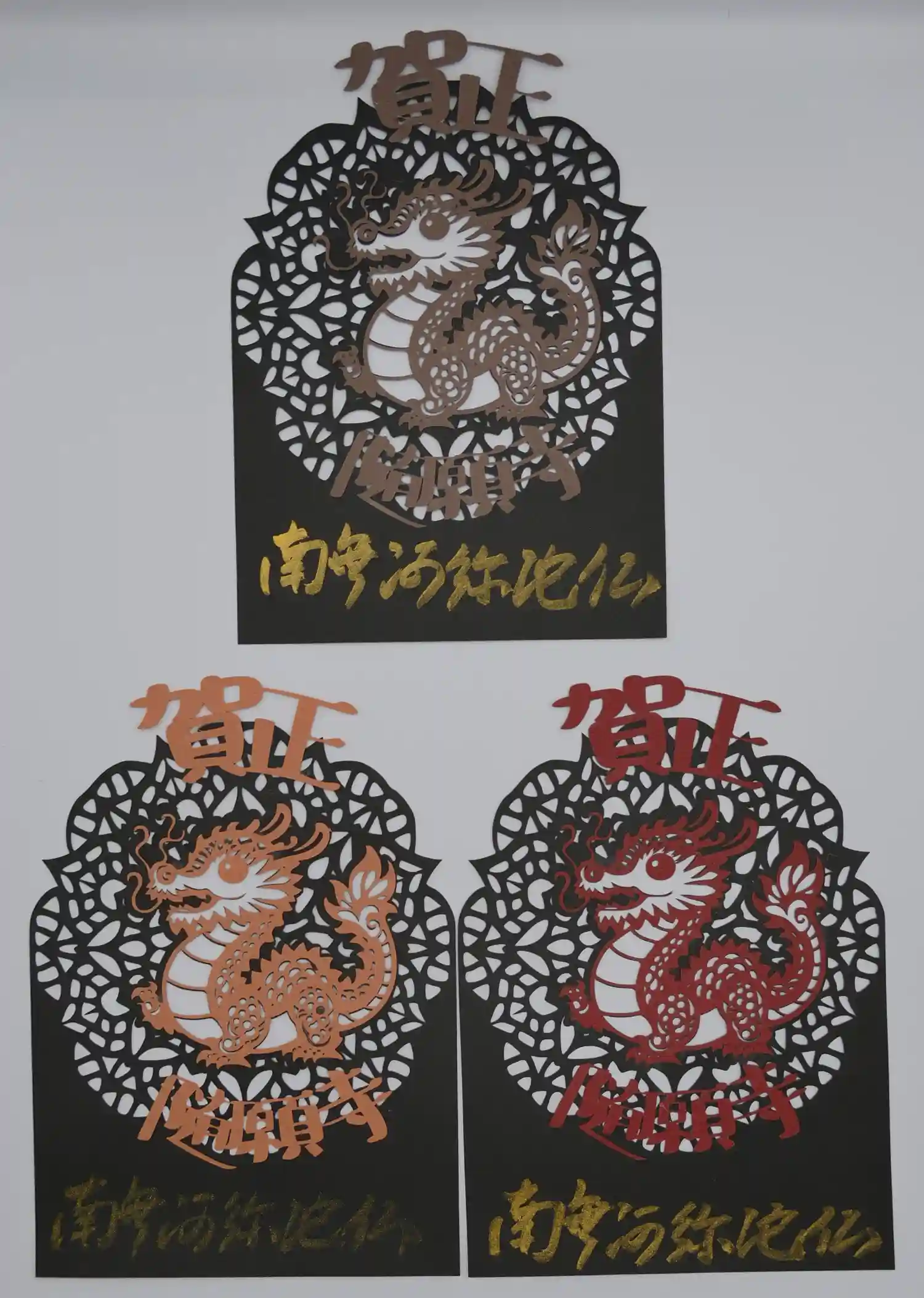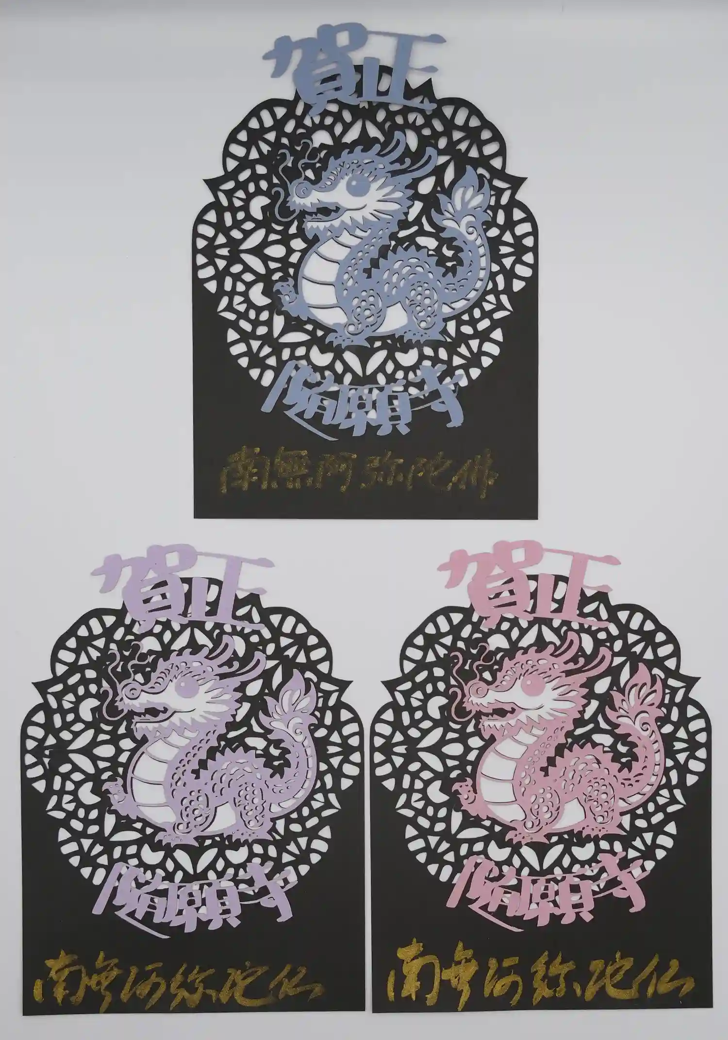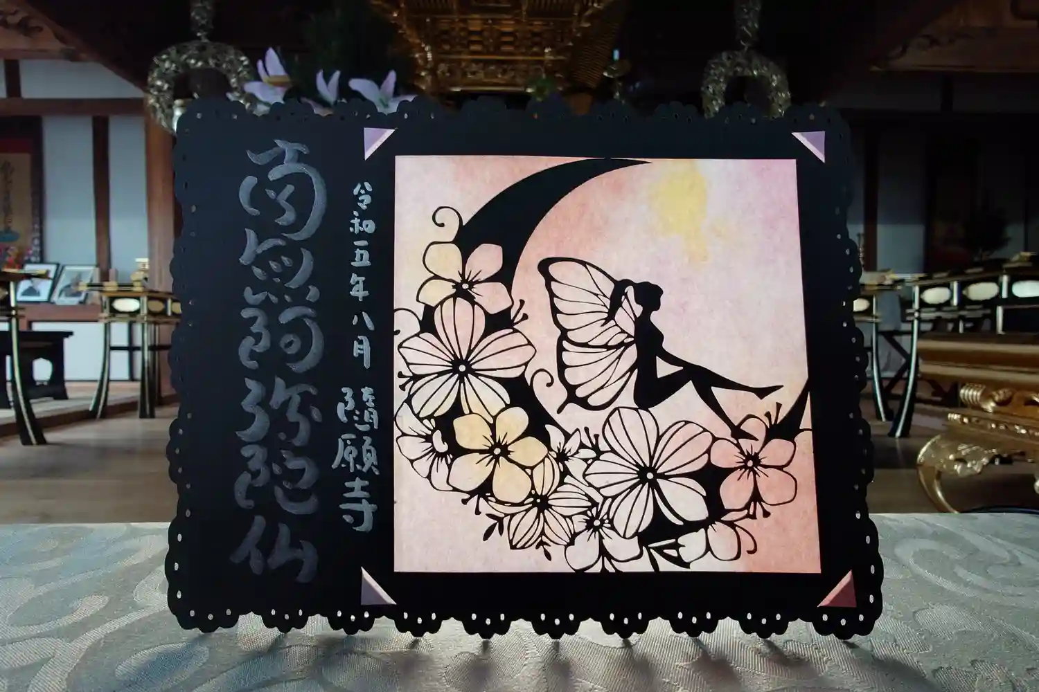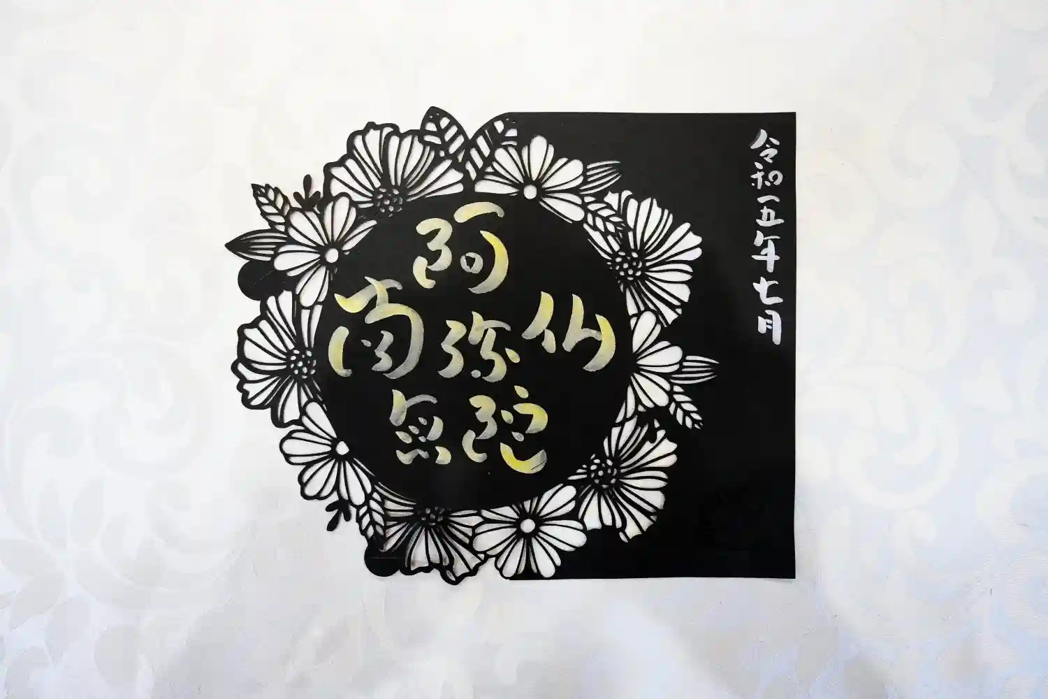 三色の紙を使用し切り絵に仕上げました。中央には「慈悲」の二文字を書き込みます。