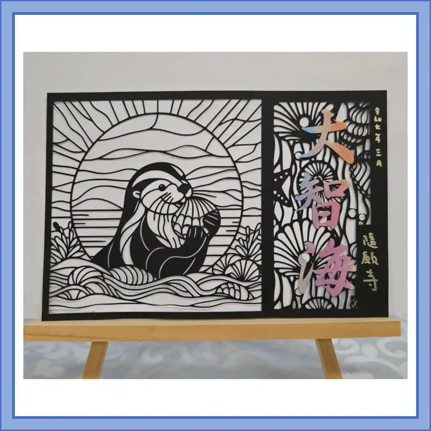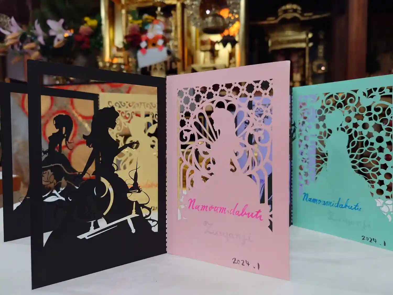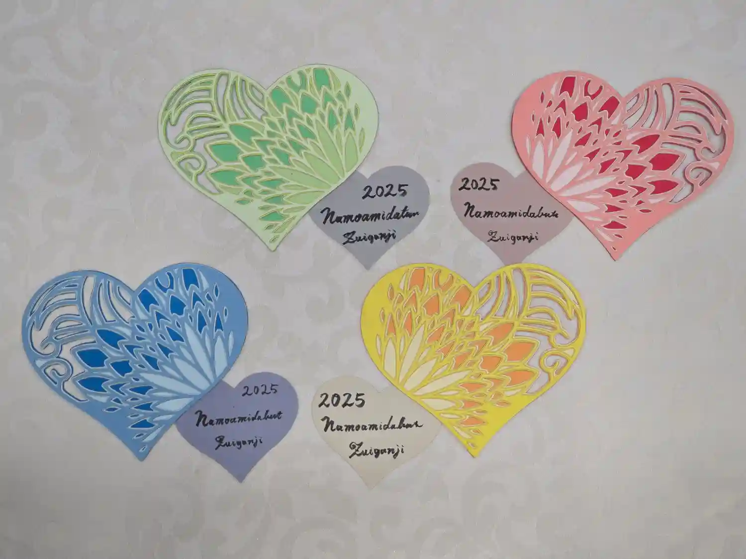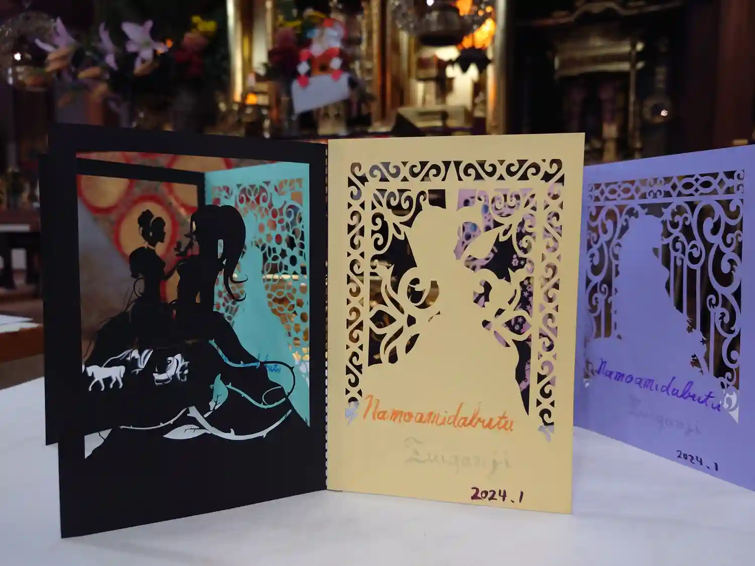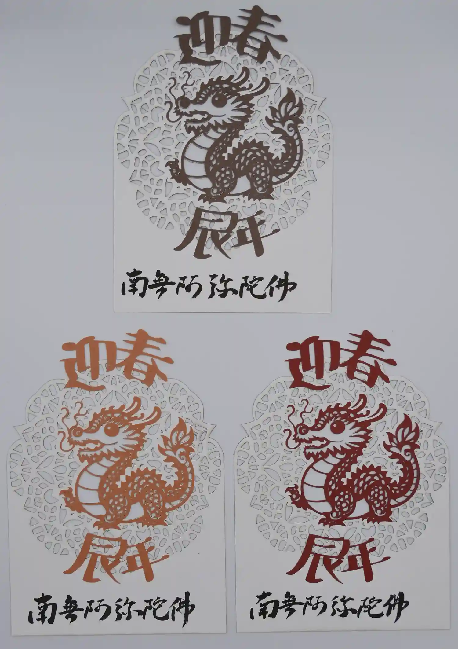 三色の紙を使用し切り絵に仕上げました。中央には「慈悲」の二文字を書き込みます。
