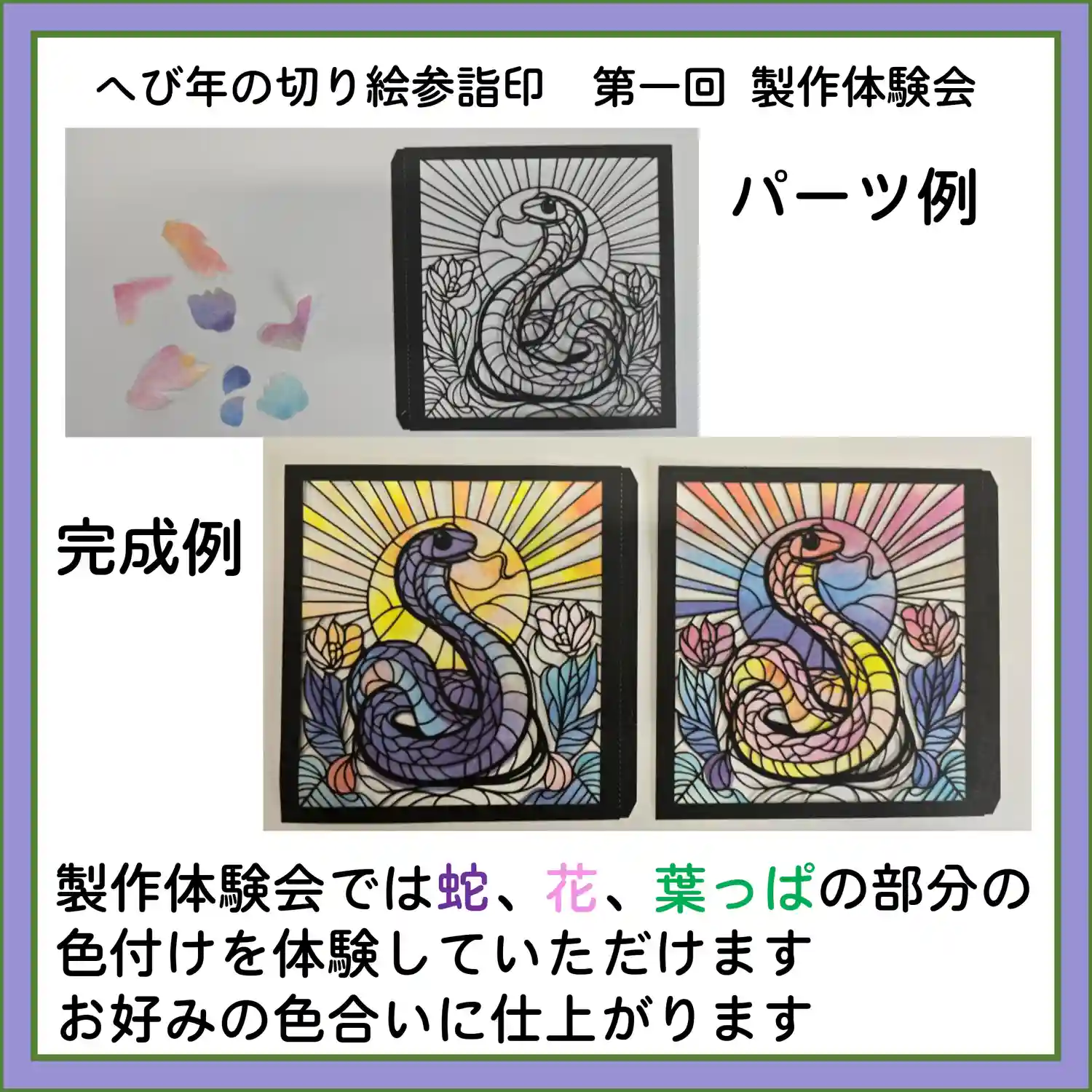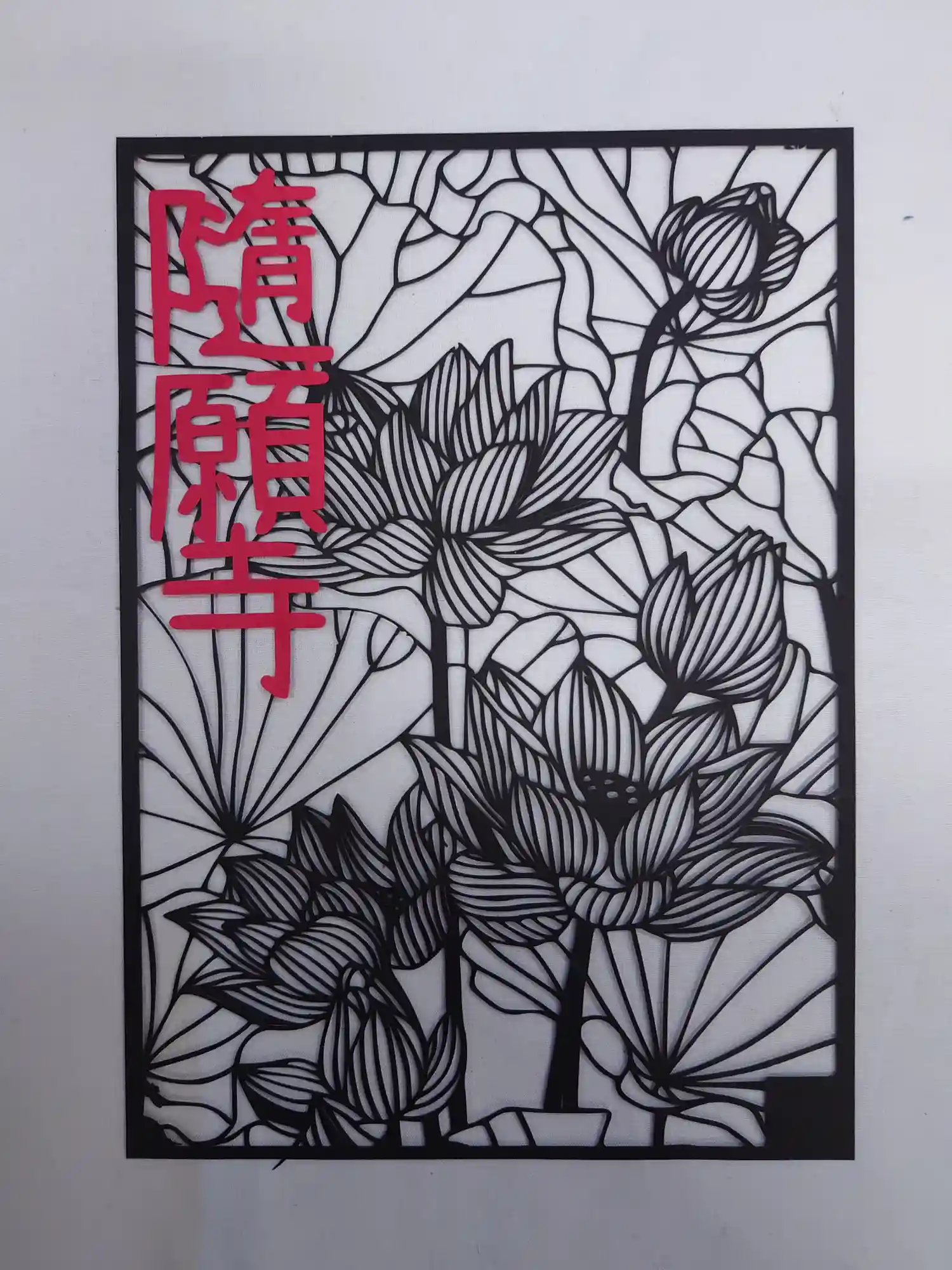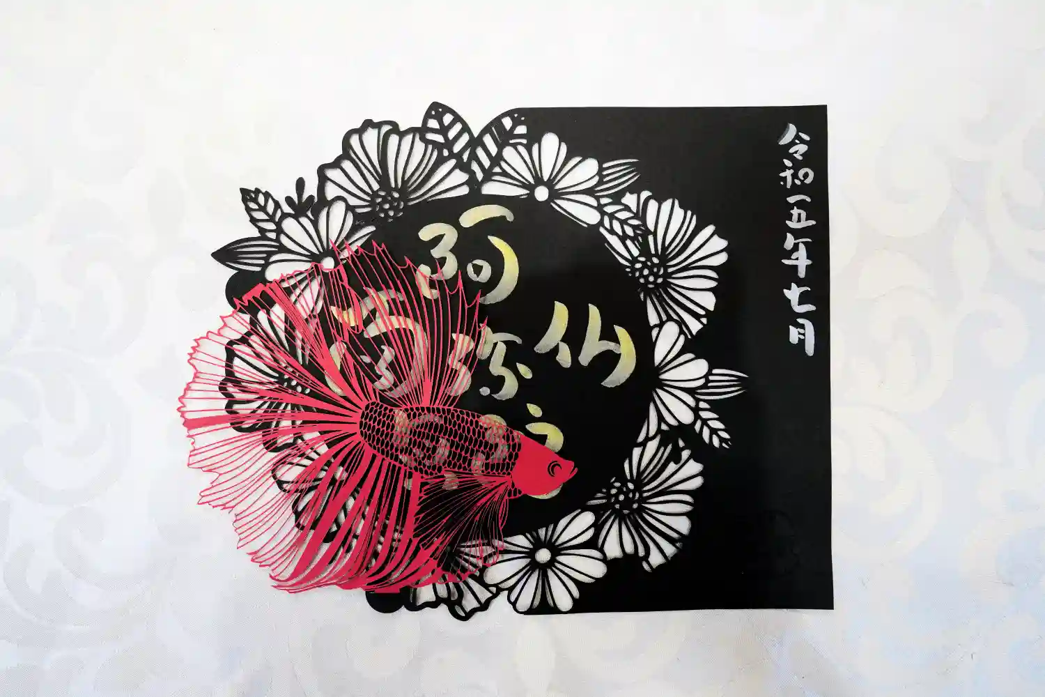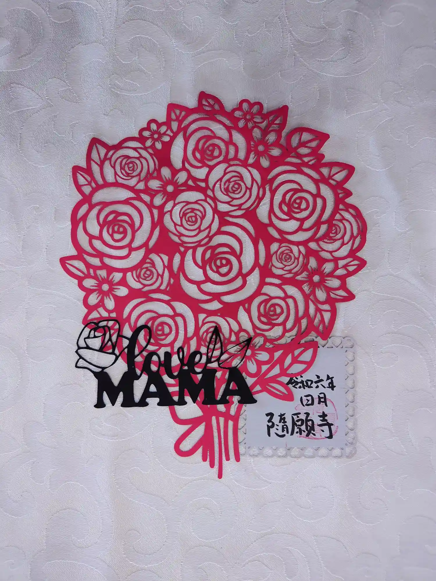 三色の紙を使用し切り絵に仕上げました。中央には「慈悲」の二文字を書き込みます。