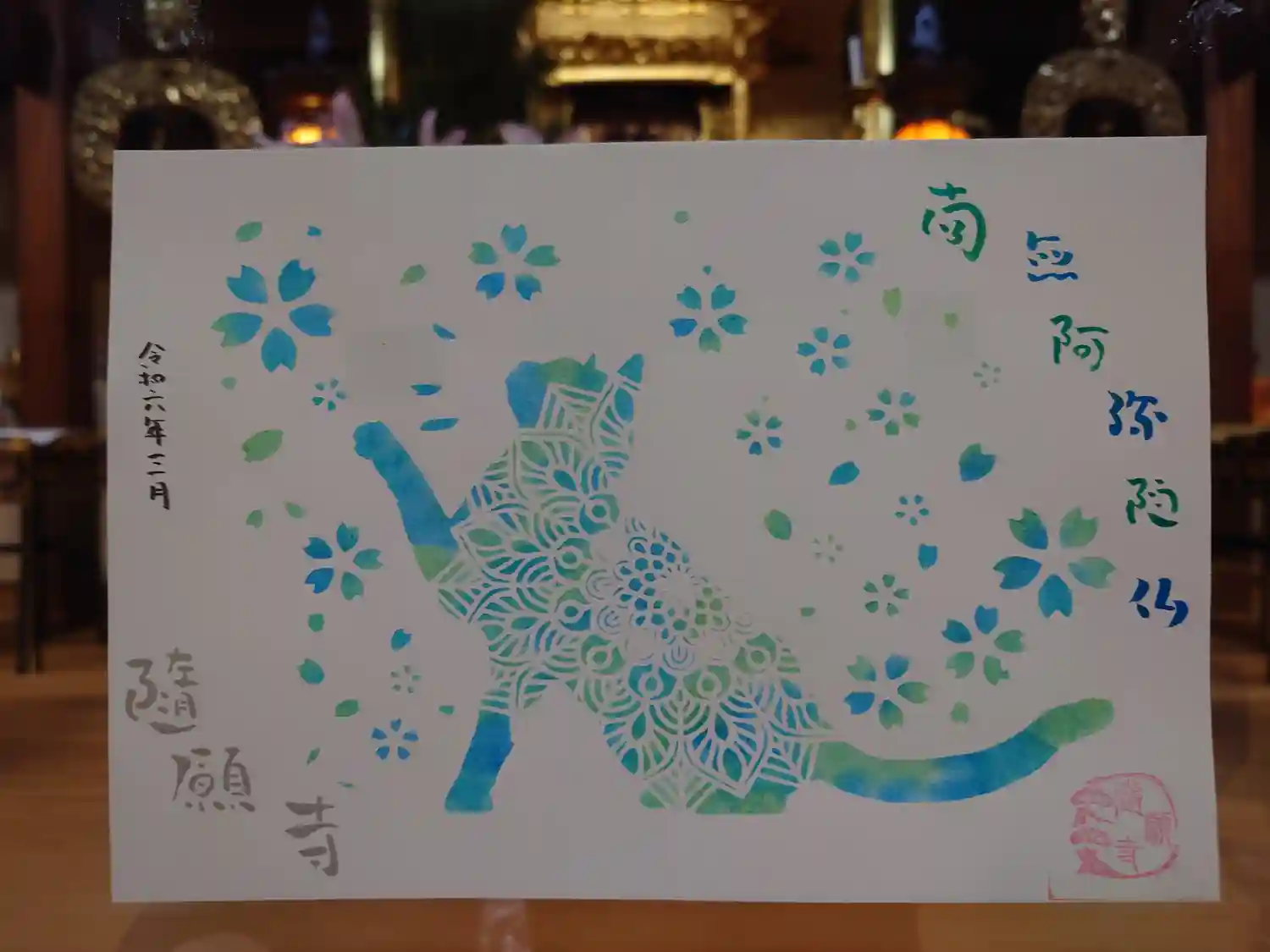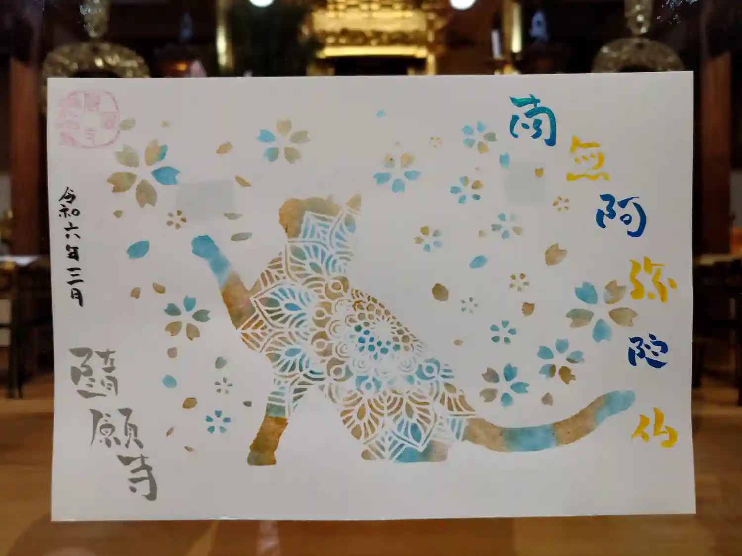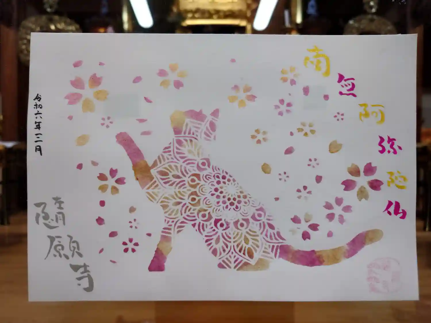 本堂内にてサバトラちゃんのアート御朱印を撮らせて頂きました。