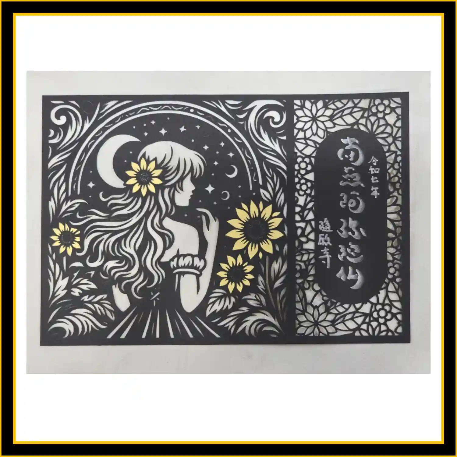 月夜で向日葵畑の中で立っている女性を切り絵でデザインしました。右…