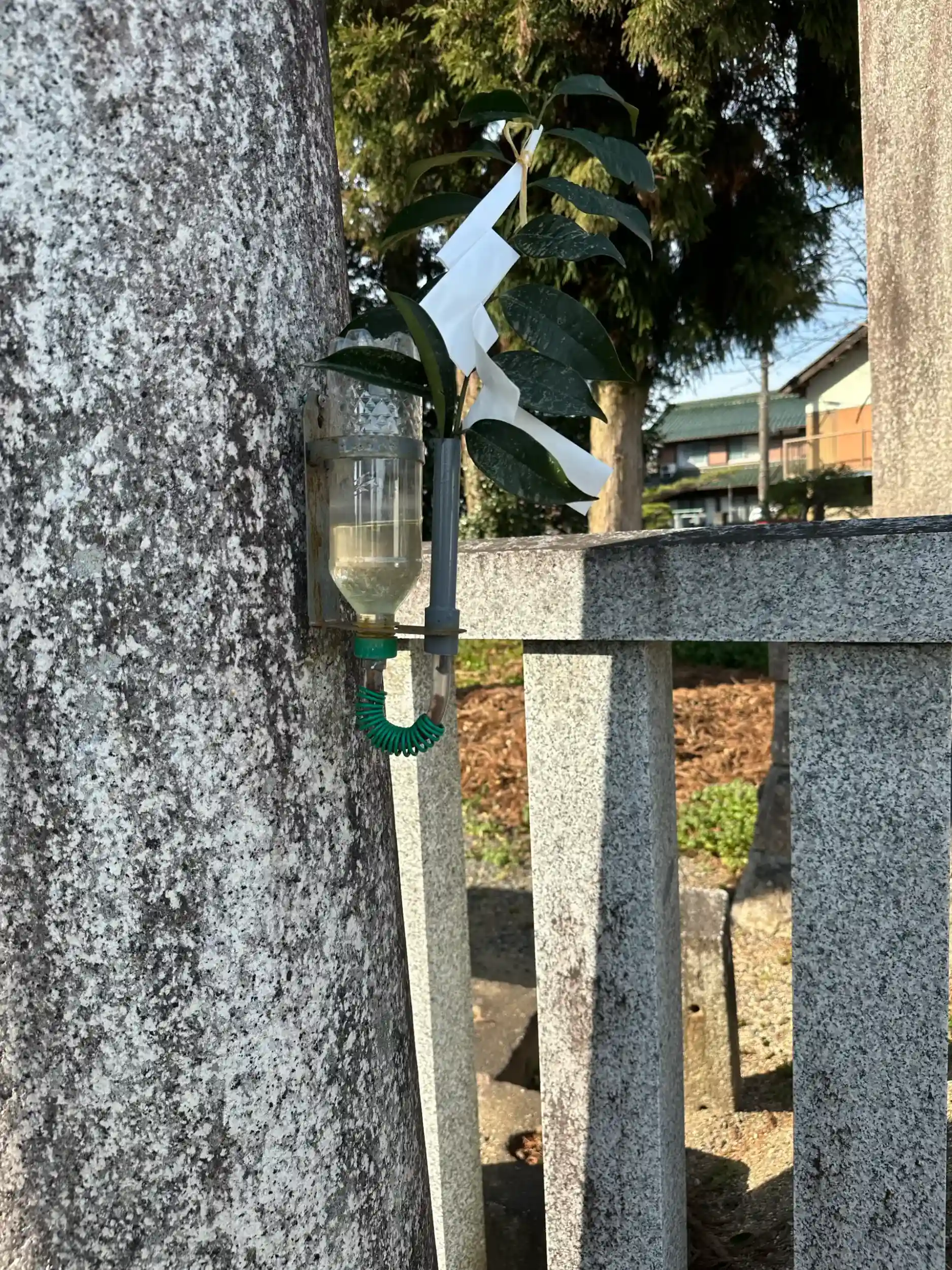 鳥居の柱に榊の枝が括り付けられていることはよくありますが、こちらはそのうえで水が供給されるようにペットボトルが備え付けられています。