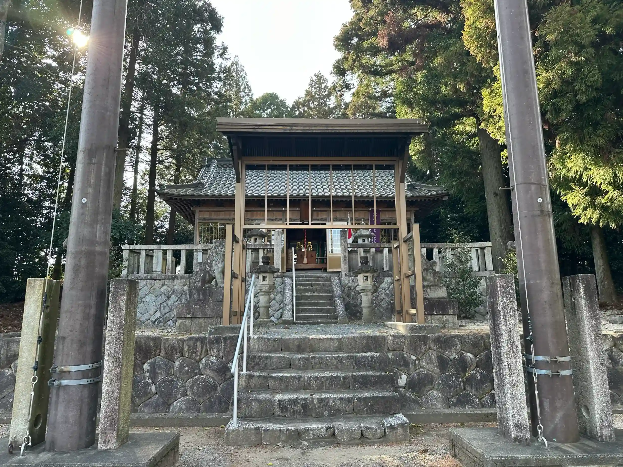 簡易な神門とその前には旗を掲揚する柱があります。
