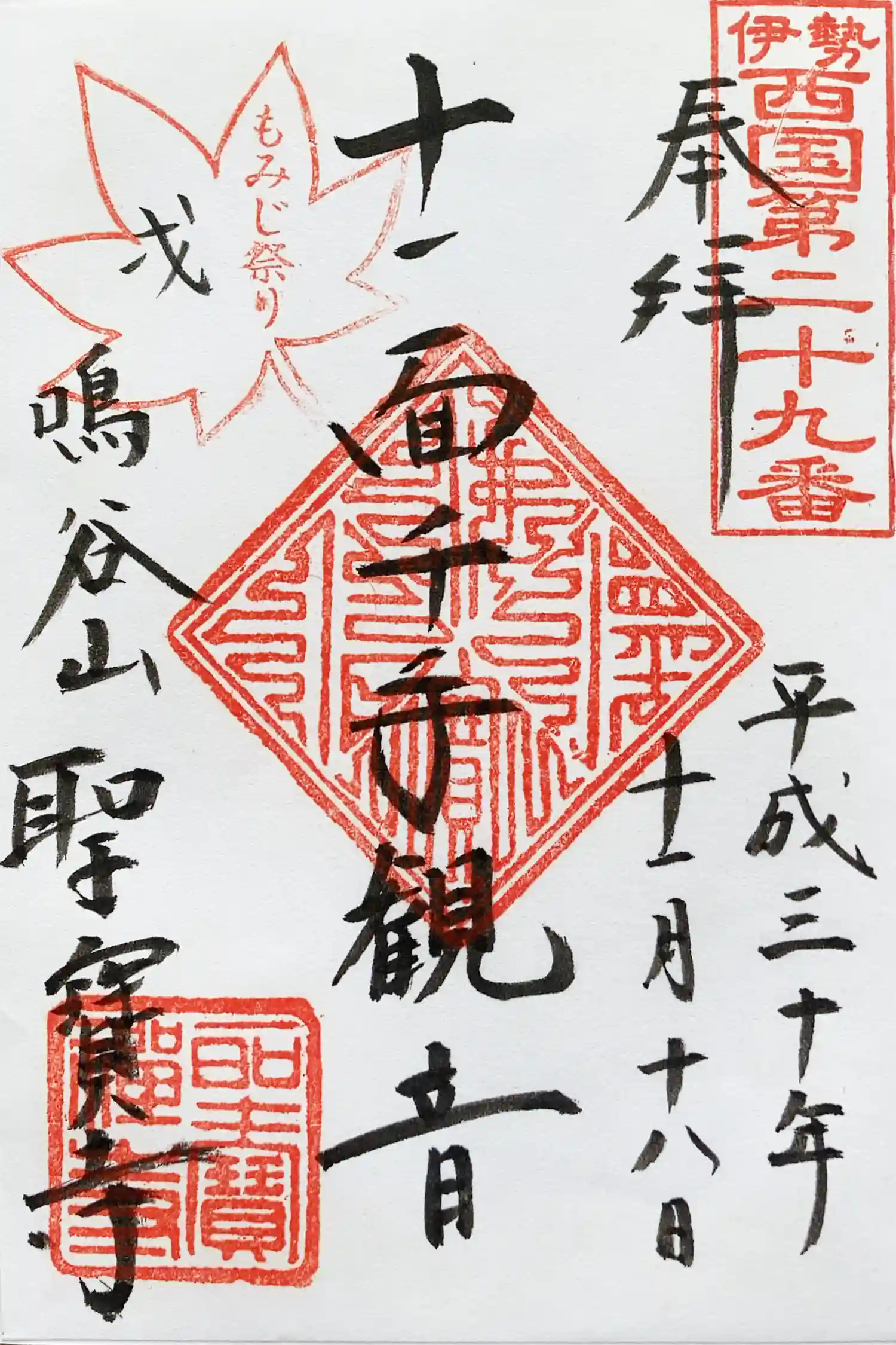 もみじ祭り限定御朱印。左上にもみじ祭りのはんこがあります。