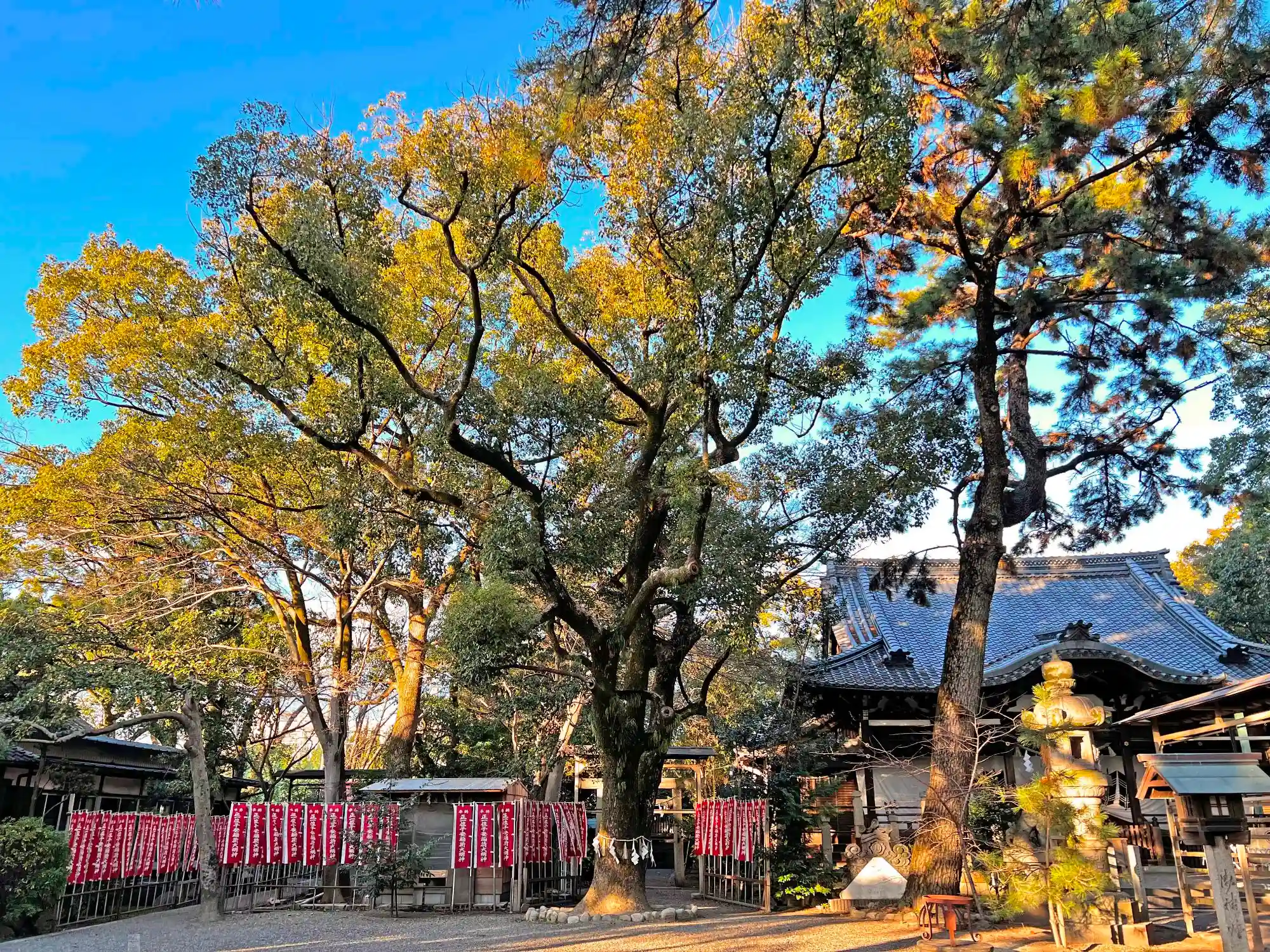 授与所前から見た<社殿>全景。社殿前には背の高い<御神木>が見える。
