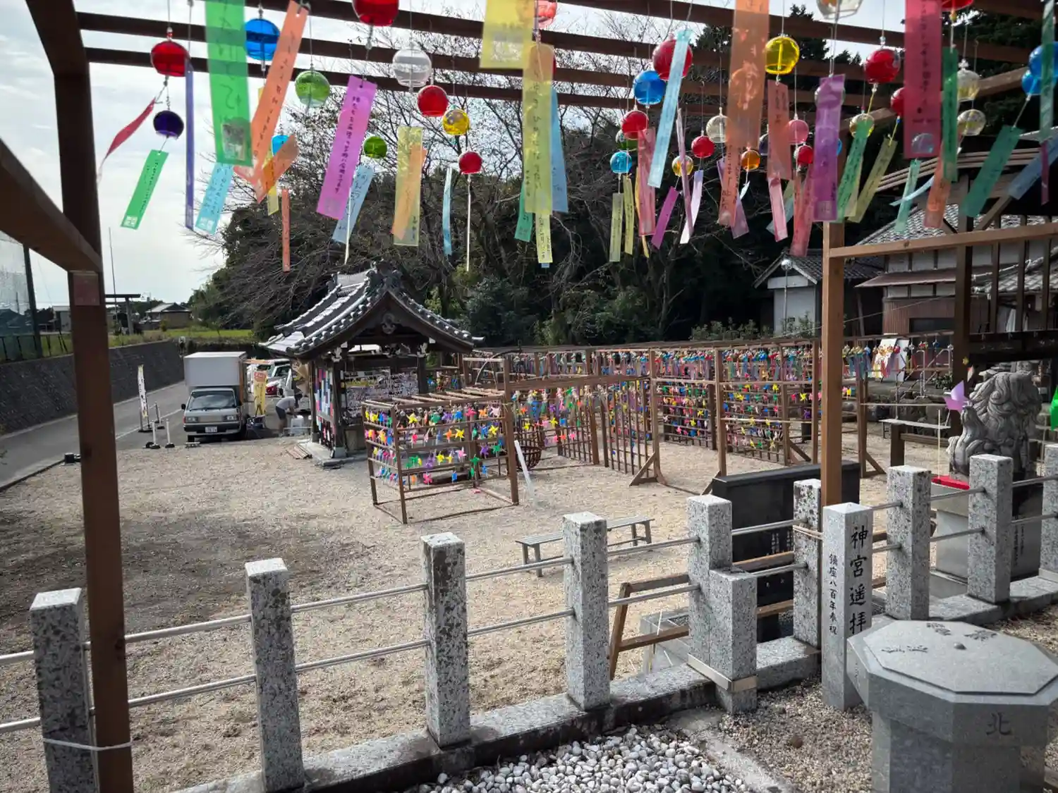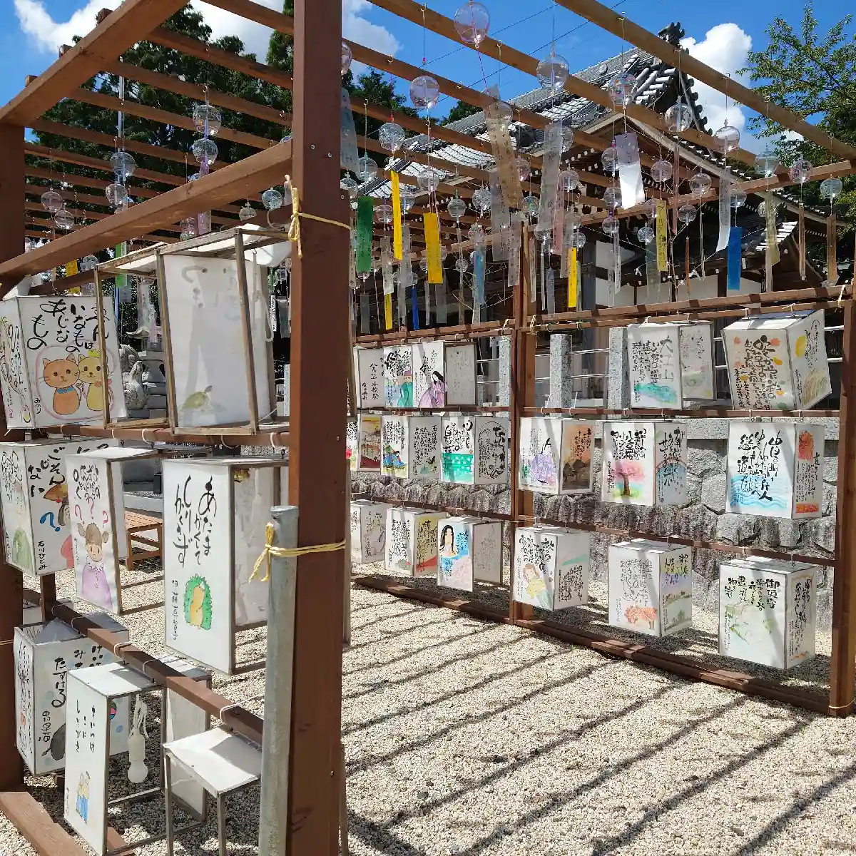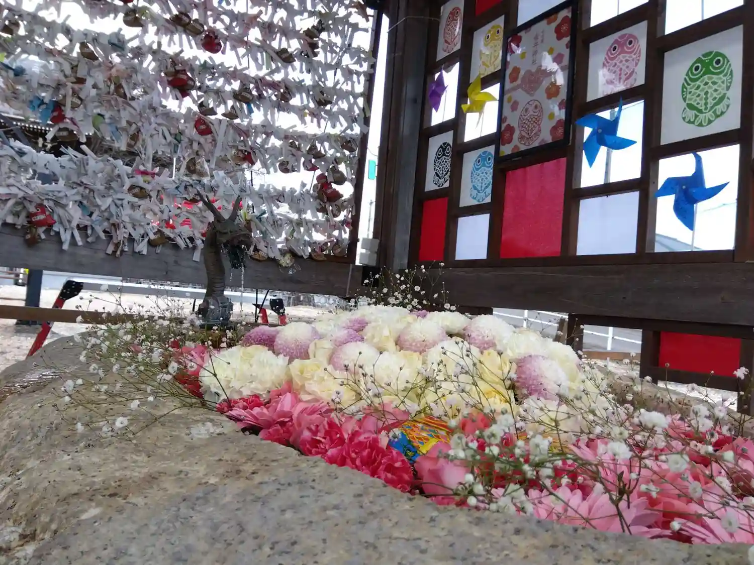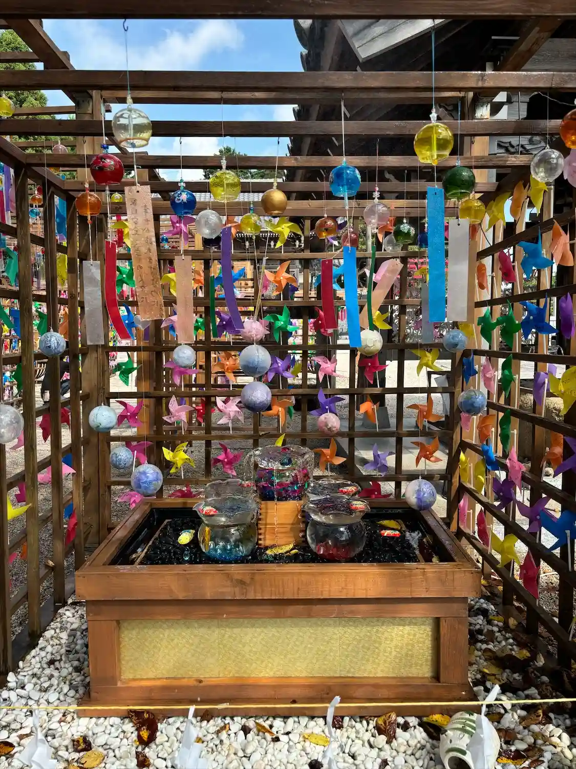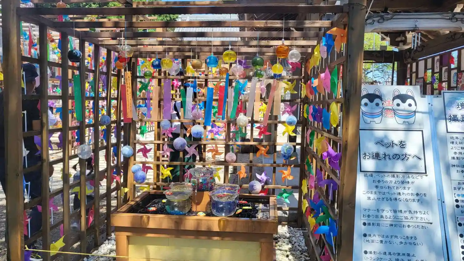 花手水が綺麗でした。子どもたちの純粋な気持ちが書かれた風鈴と風…