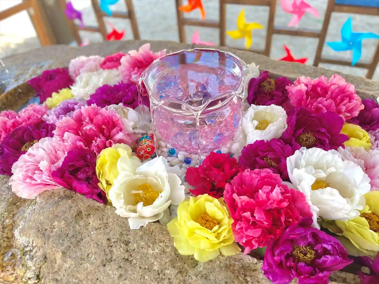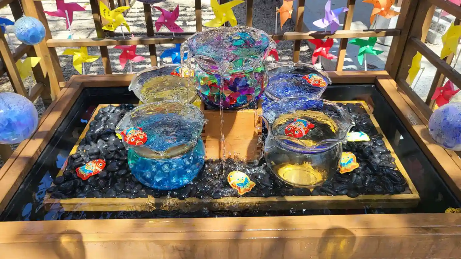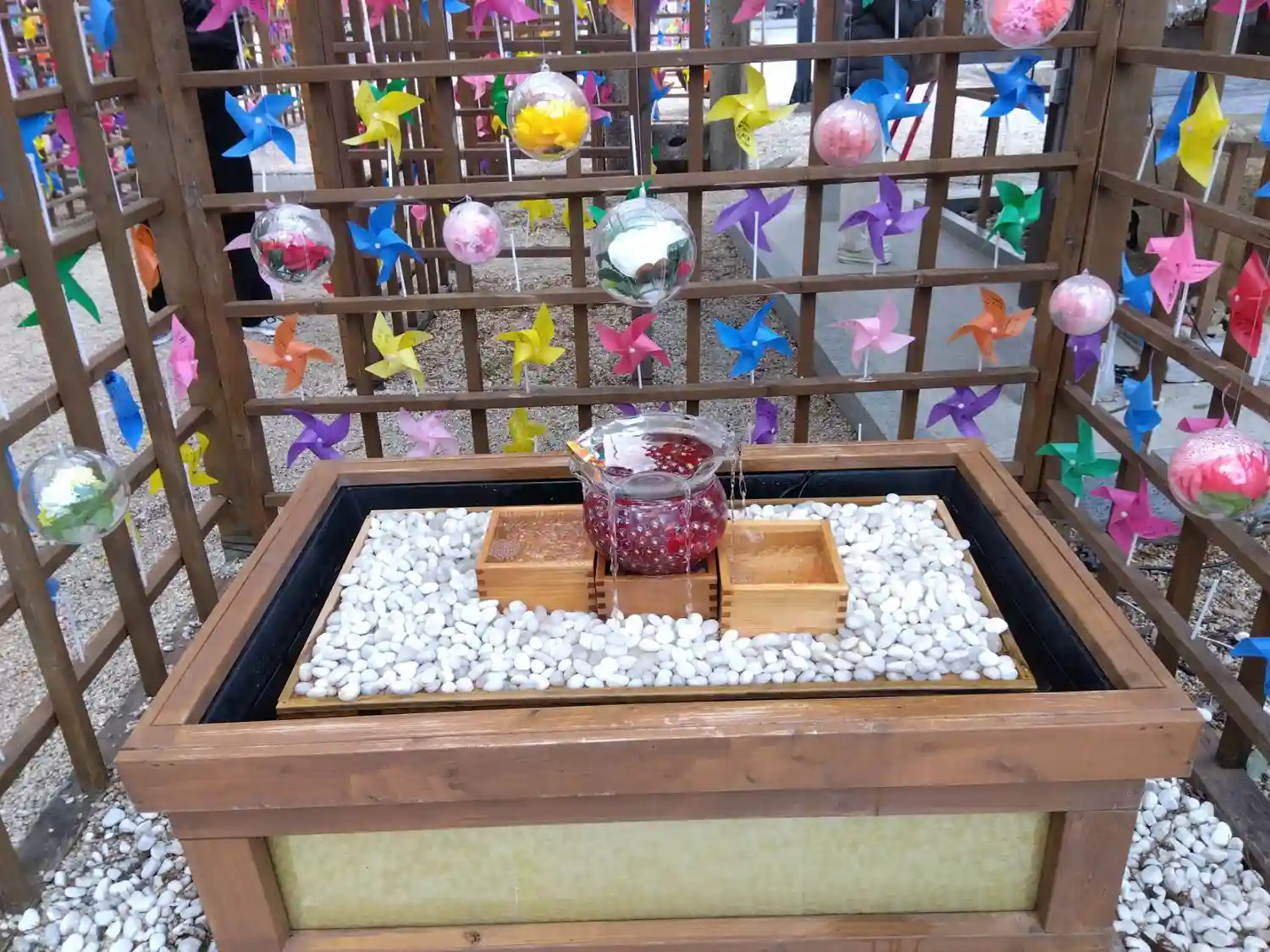 境内はとても綺麗にされており、花手水や風車で彩られています。