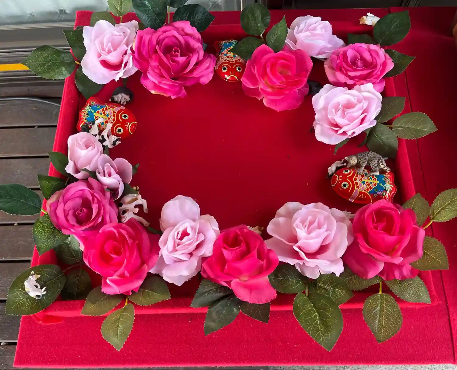 花手水 ブリキの金魚は秋バージョン?